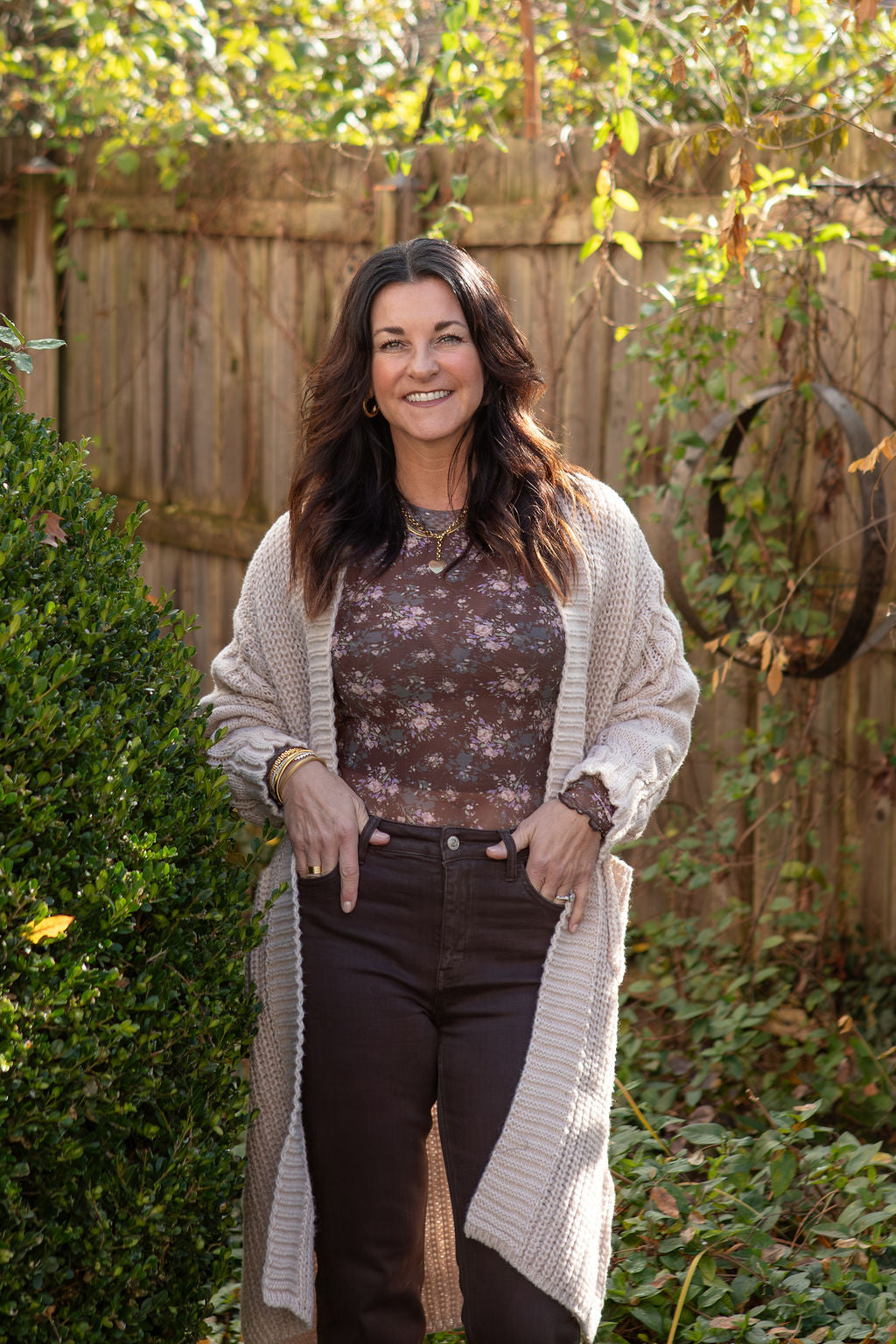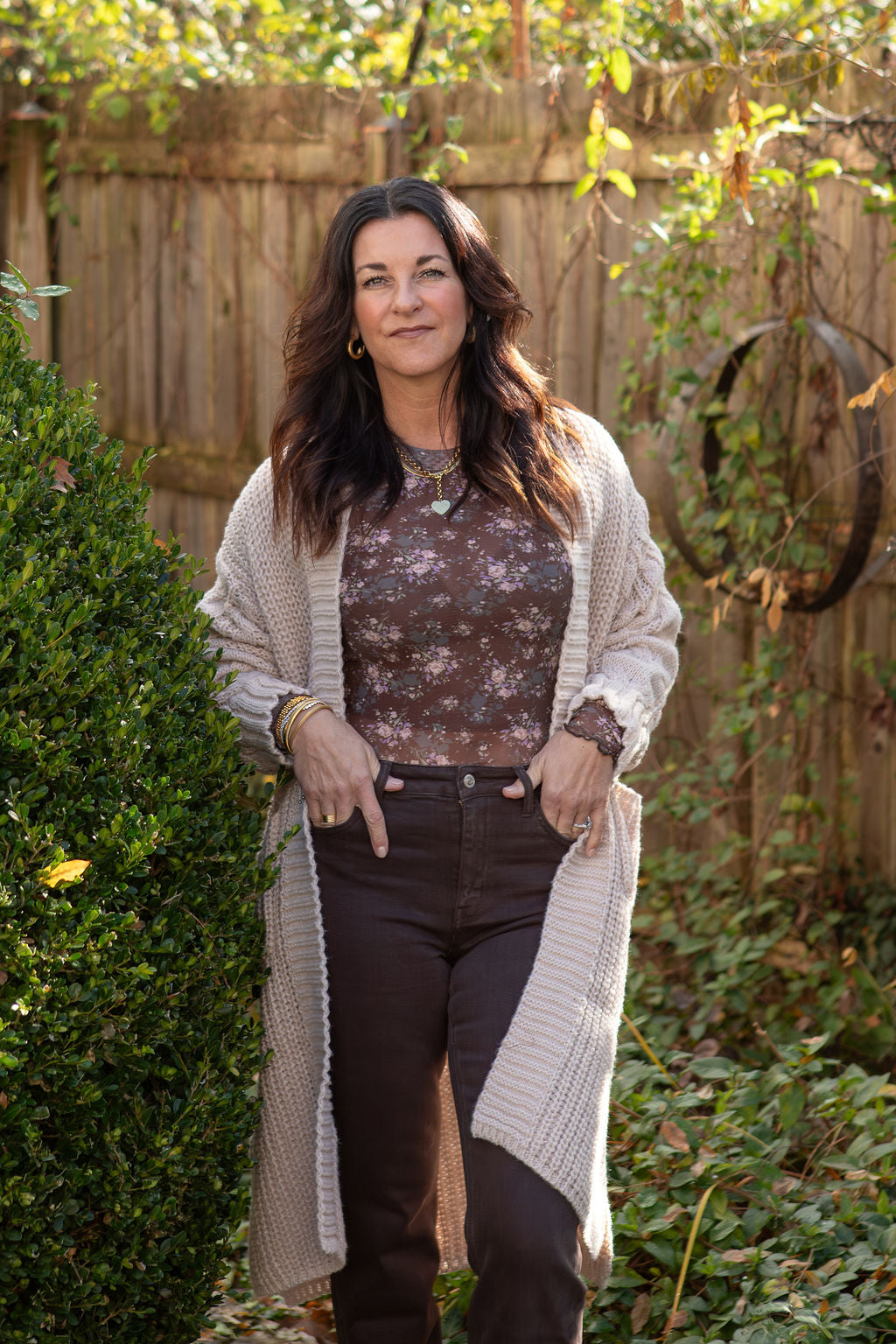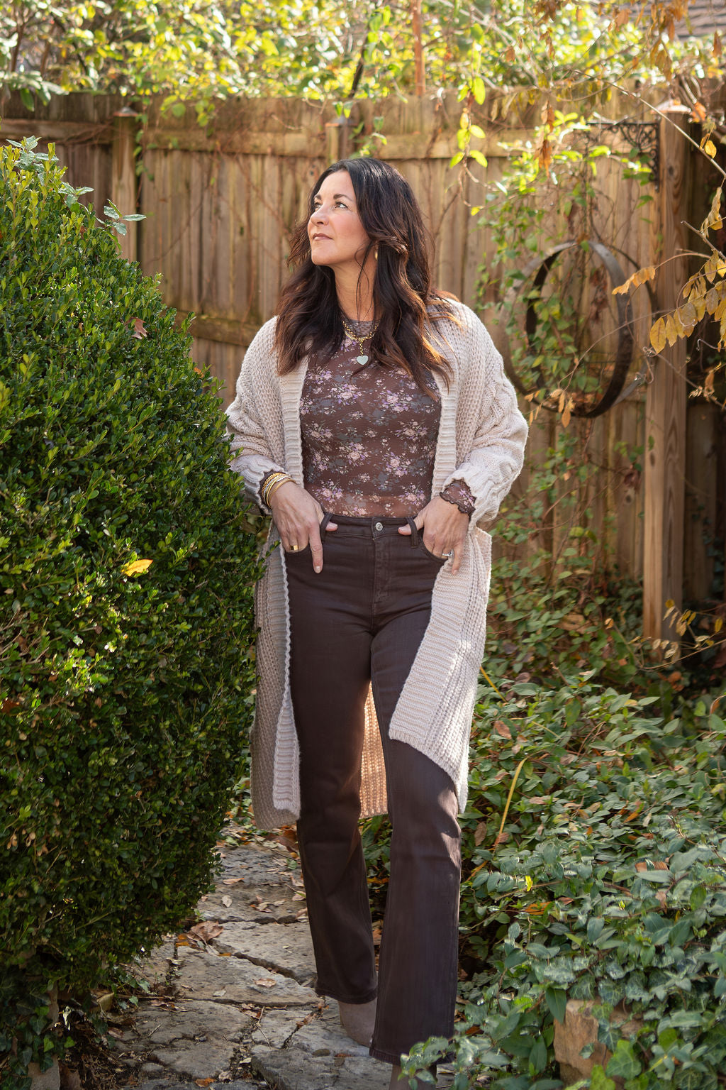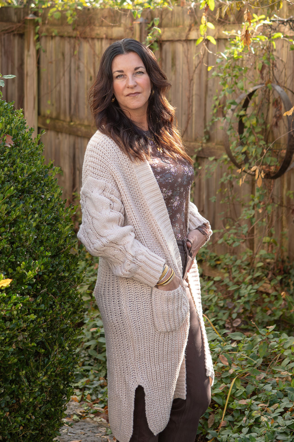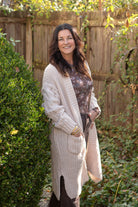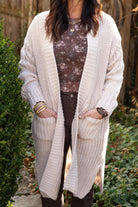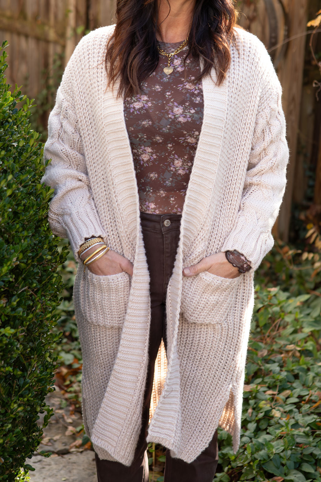 Long oat-colored knit cardigan with side pockets and dropped shoulders. Just hot cocoa in hand!