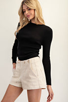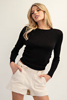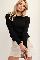 This fitted long sleeve knit top showcases a sleek, ribbed texture, subtle side ruching for a flattering silhouette, and a classic round neckline, offering a versatile and chic look perfect for layering or wearing on its own.