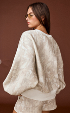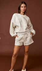 -Two-piece matching set -Soft washed fabric with tonal tie-dye finish -Oversized crewneck -Sweatshirt with ribbed trim -High-waisted drawstring shorts with side pockets -Casual days -Travel outfit -Weekend relaxation