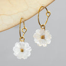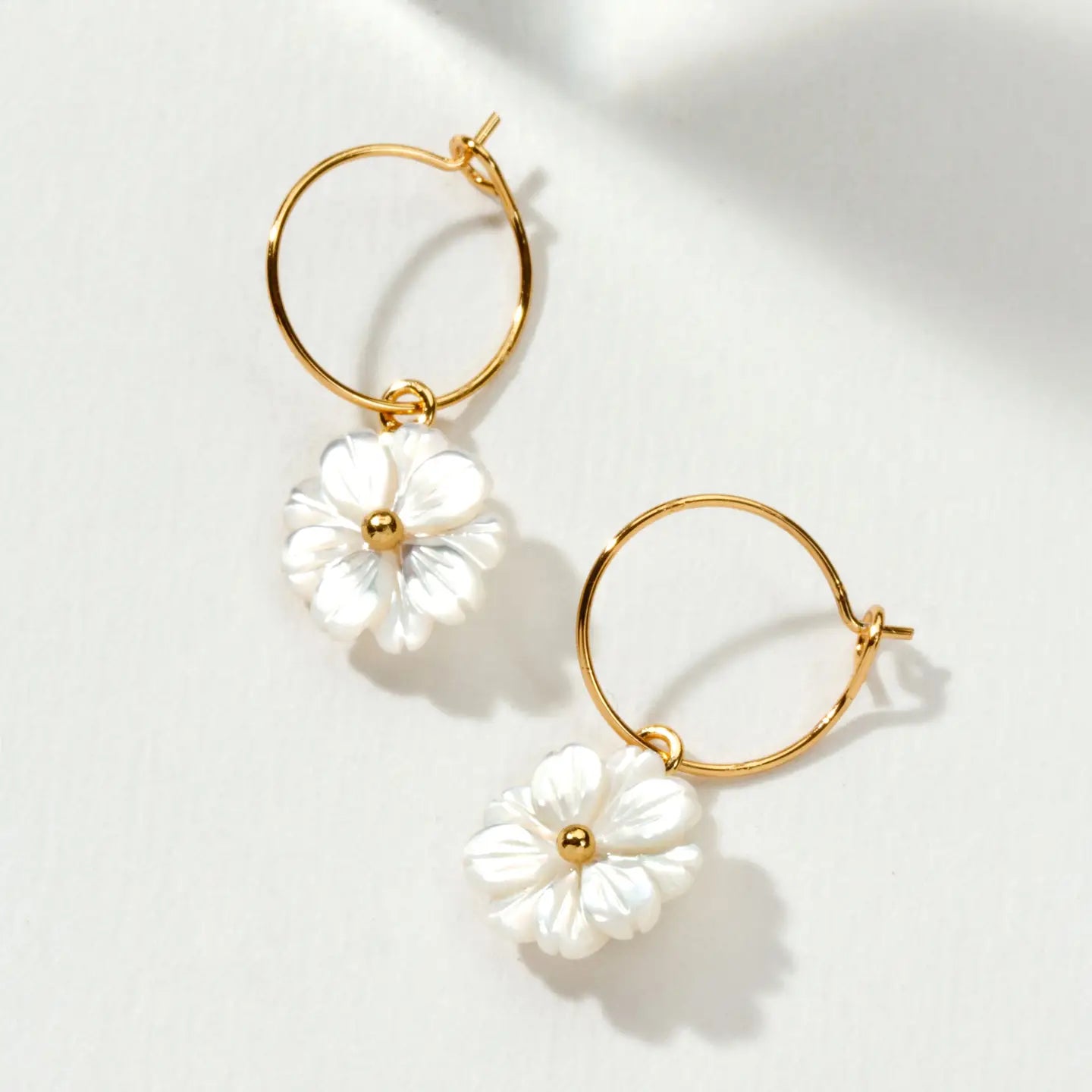 Welcome the sunshine, day in and out! This dainty size hoop is perfect worn solo or mixed with your other favorite earrings—a timeless piece you can add to any look. The delicate hand carved mother of pearl shell daisy symbolizes happiness, making this something special for yourself or a loved one.