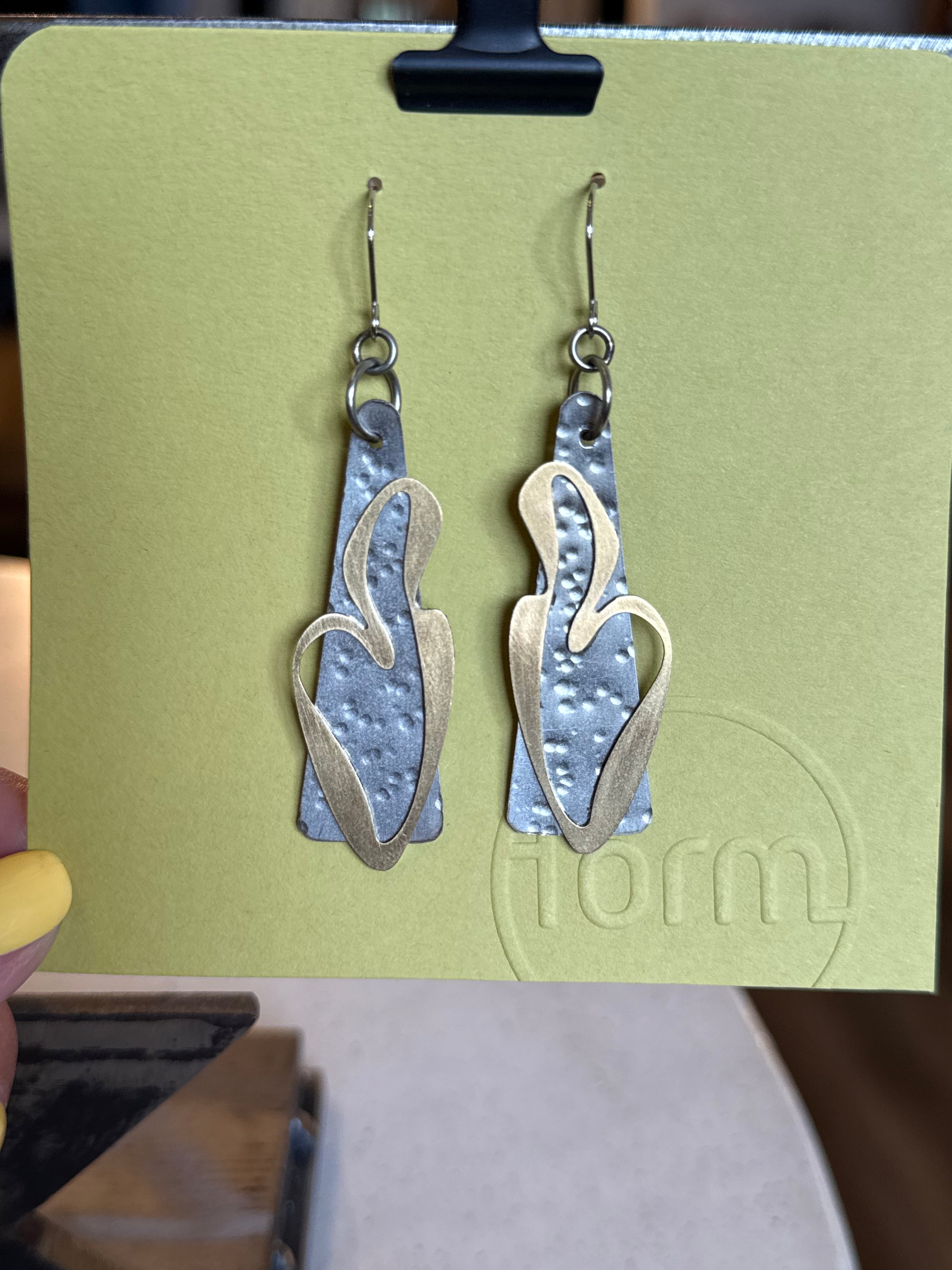 Handmade metal work by Form: by Cindy Schnell. Beautifully welded stainless and brass earrings.
