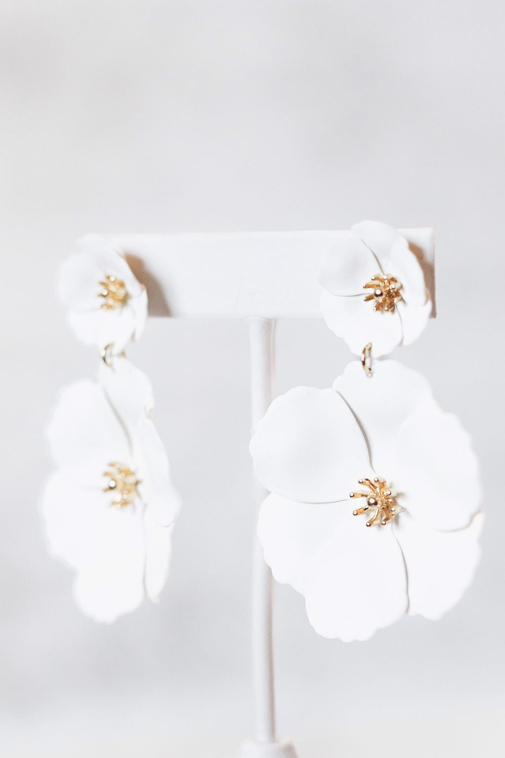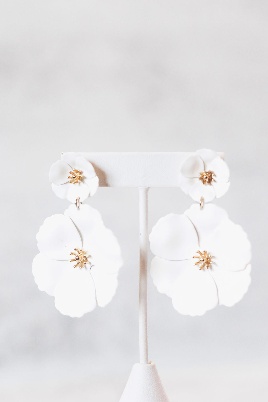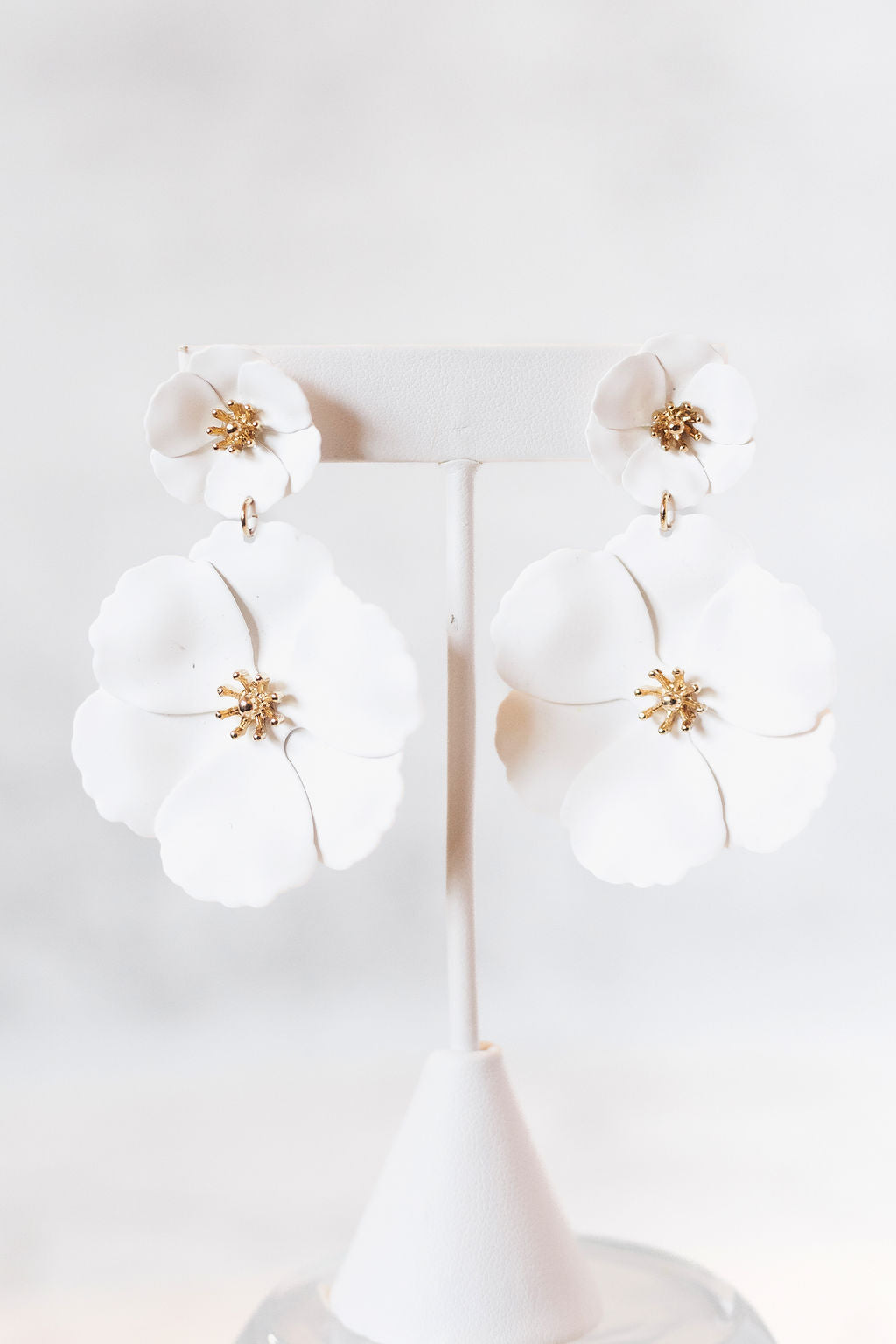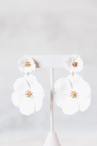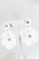 Add a touch of whimsy to your look with these White Double Flower Earrings. Featuring two delicate blossoms stacked for extra charm, they brighten any outfit with a fresh, floral vibe. Perfect for playful days and sunny smiles!