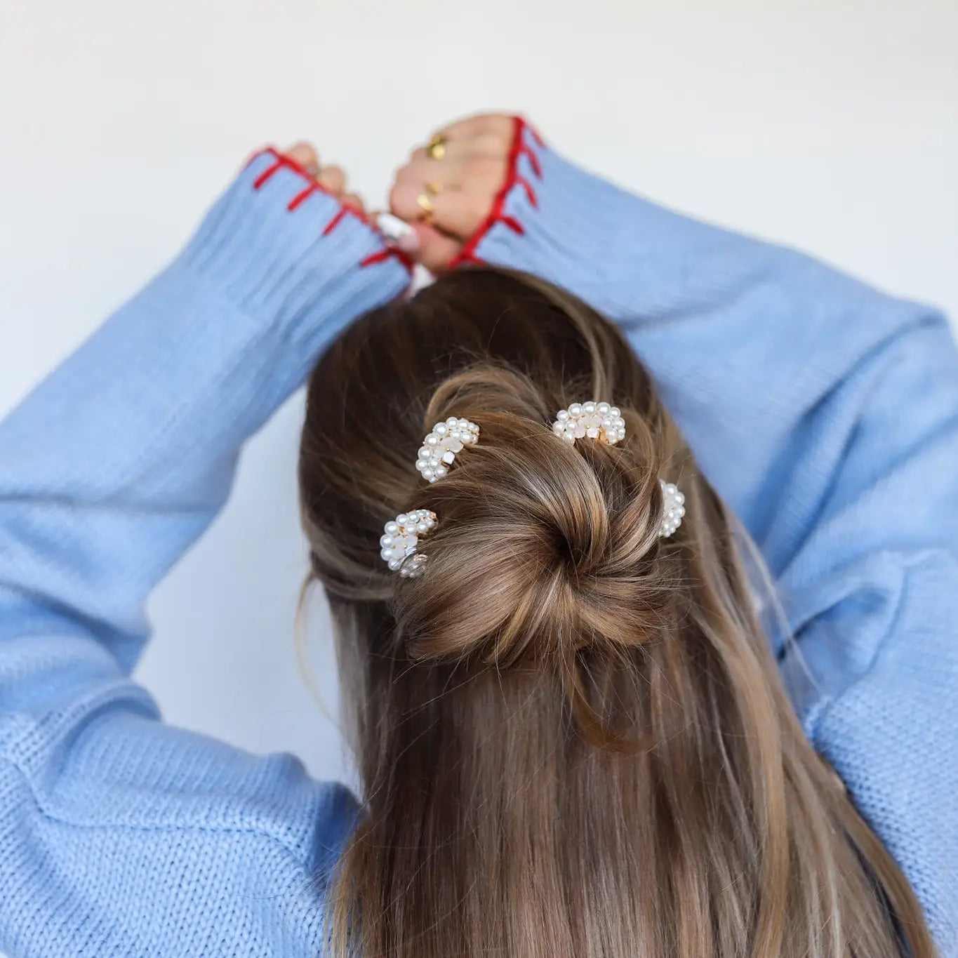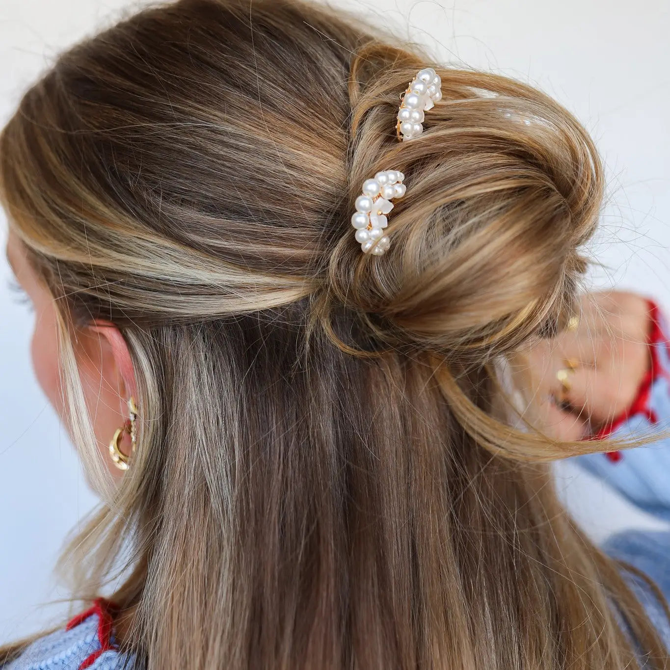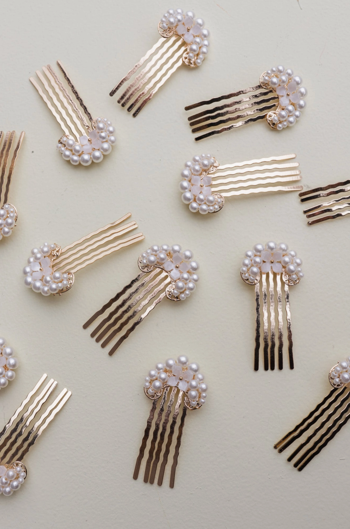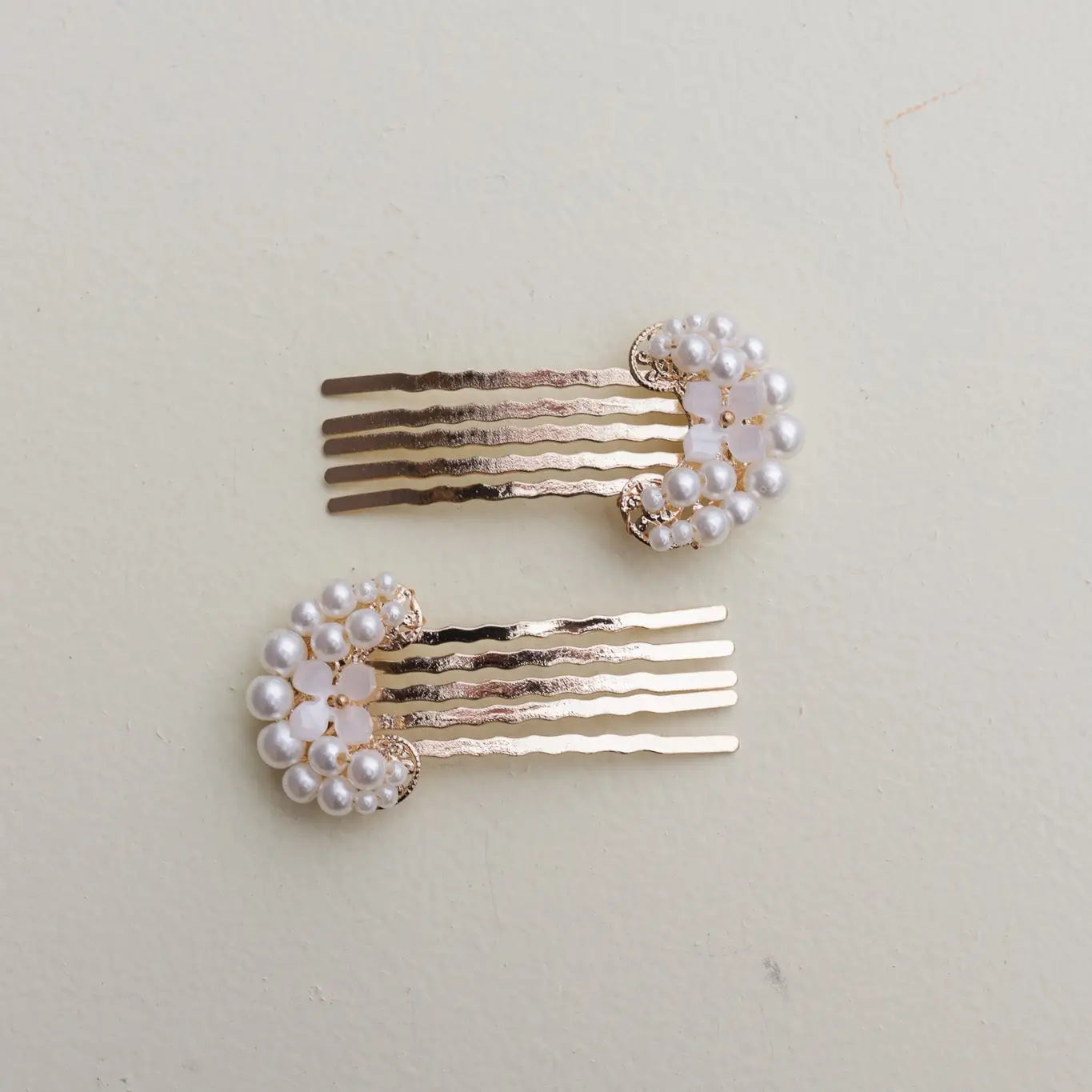 Elevate your updo with these charming gold metal hair combs adorned with pearl clusters and delicate beaded flowers. Perfect for adding a vintage-inspired touch to any hairstyle, these petite combs are an easy way to create a polished, elegant look reminiscent of timeless grandma style.