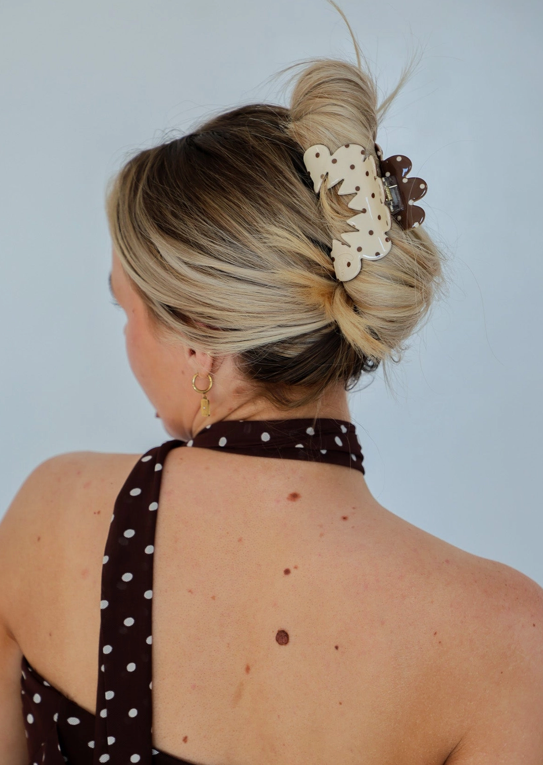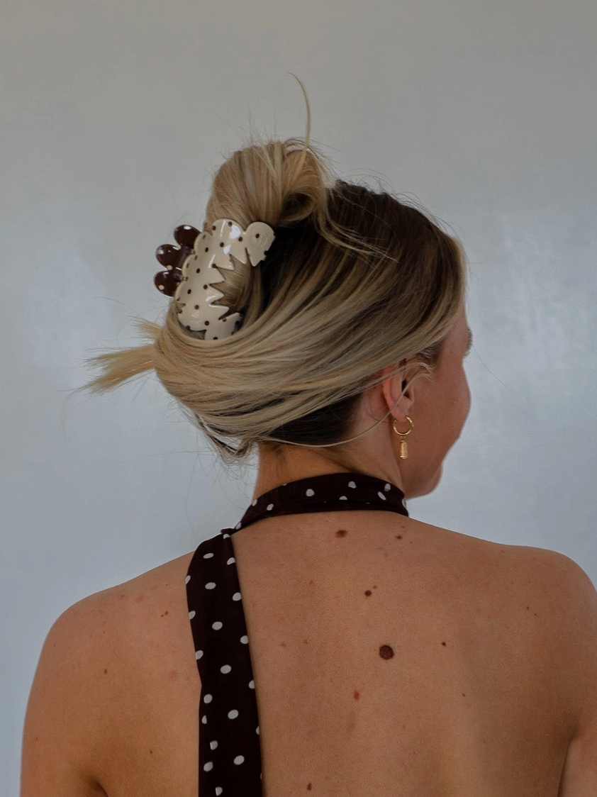Inside of claw is brown with cream polka dots, and exterior is cream with brown polka dots. Midi Size.