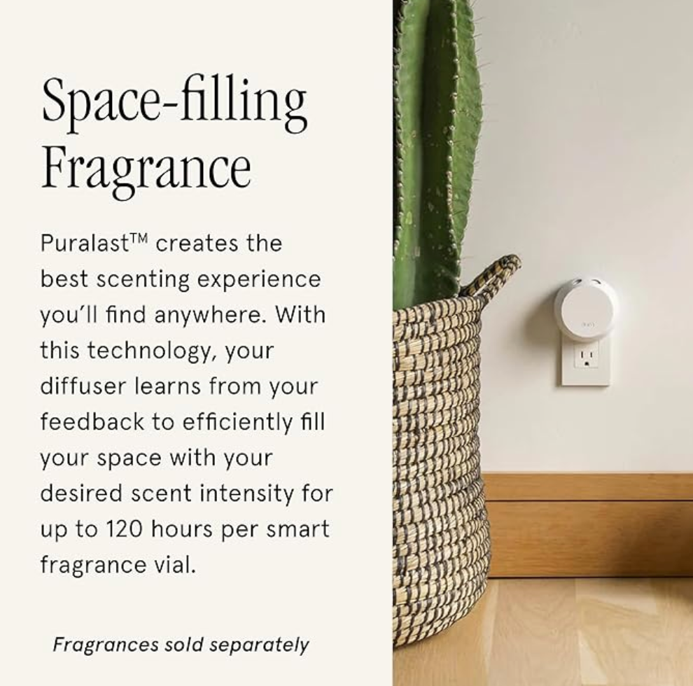 - Personalized Scent Experience: Utilizing Puralast technology, our diffuser adapts to your preferences, providing up to 120 hours of customized fragrance intensity from each smart fragrance vial; Fragrances sold seperately