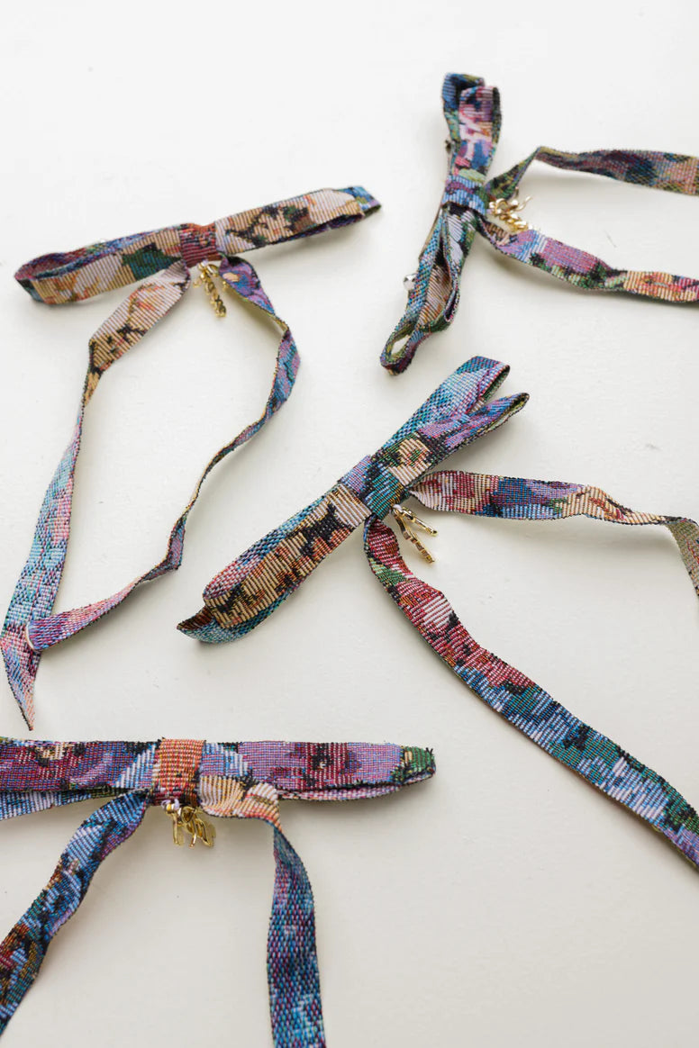 Make a simple statement with this charming skinny bow featuring our signature grandma jacquard floral design. The large barrette-style clamp stays securely in your hair all day, making it the perfect accessory for any occasion.