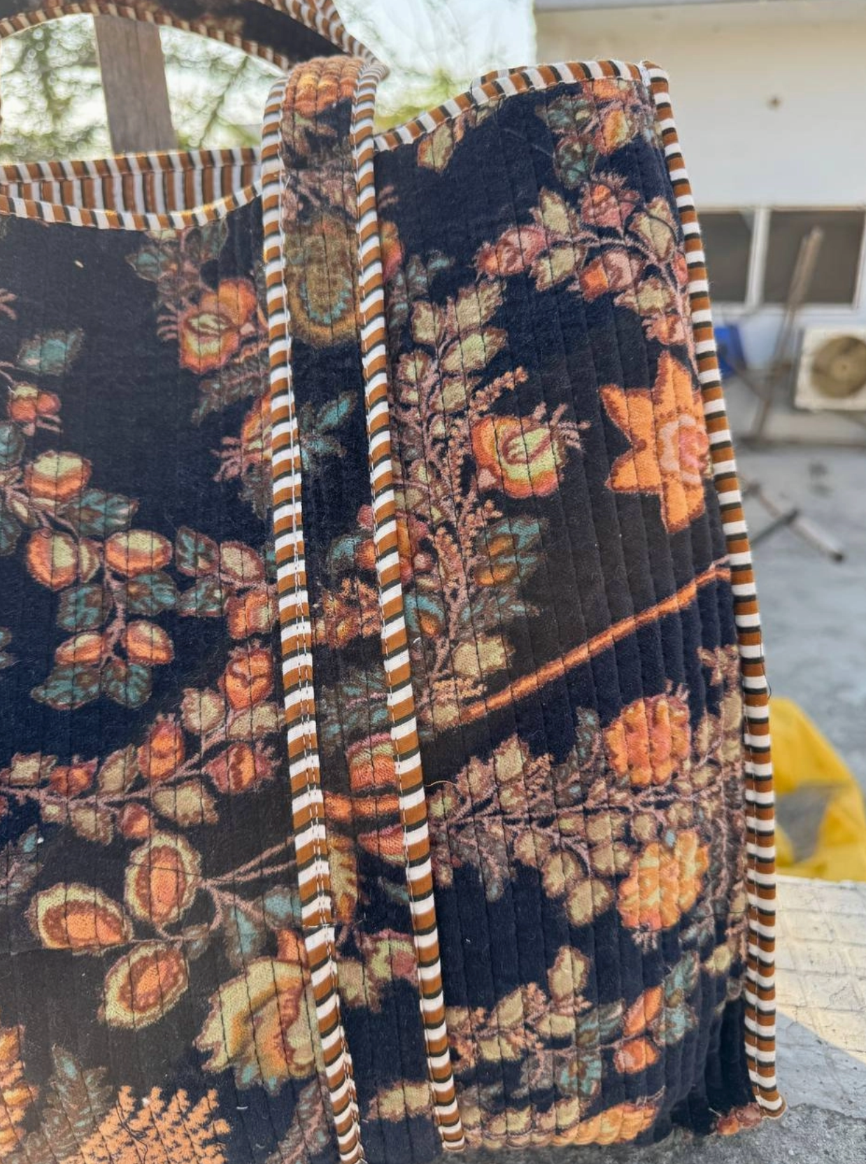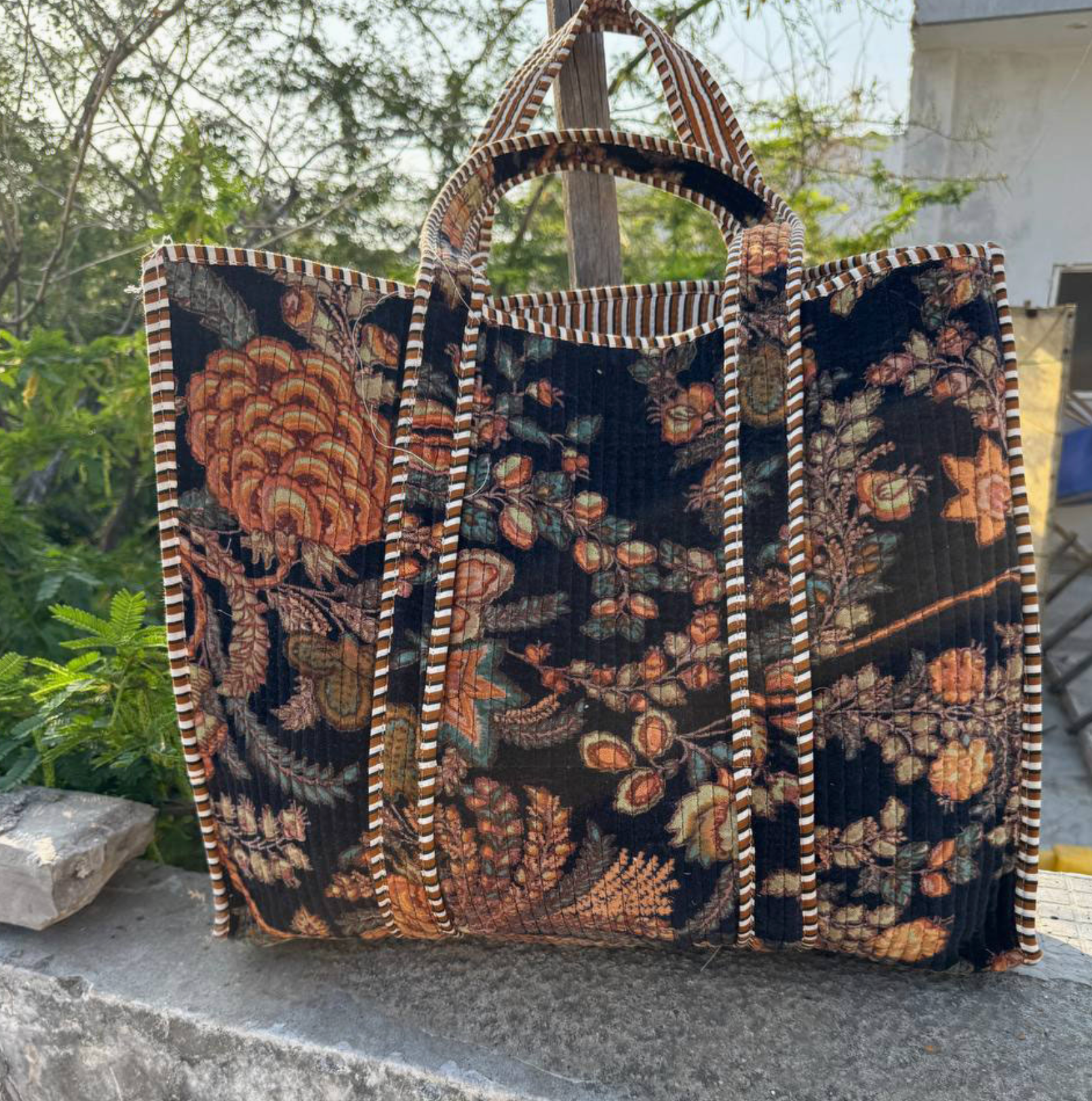 Handcrafted by skilled Indian artisans, this charming quilted tote is your new go-everywhere companion. Whether you're hauling groceries, packing for a weekend getaway, or just need a stylish everyday bag, this versatile beauty has you covered. The quilted cotton construction keeps things lightweight yet durable, while its spacious interior handles whatever you throw at it. Totally unique and endlessly practical.