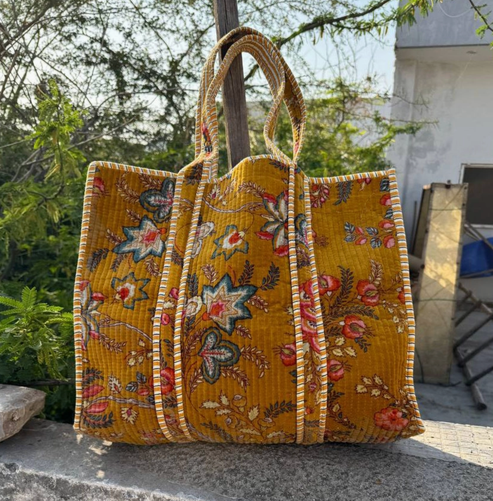 Handcrafted by skilled Indian artisans, this charming quilted tote is your new go-everywhere companion. Whether you're hauling groceries, packing for a weekend getaway, or just need a stylish everyday bag, this versatile beauty has you covered. The quilted cotton construction keeps things lightweight yet durable, while its spacious interior handles whatever you throw at it. Totally unique and endlessly practical.