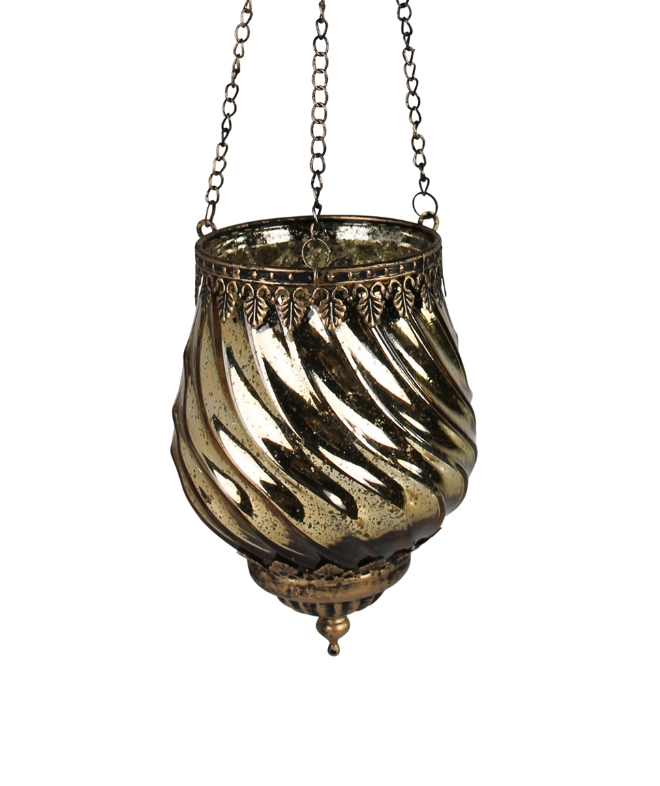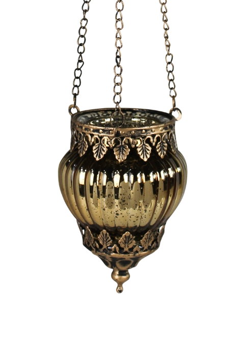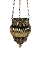 Suspended candlelight is a centuries old way to add ambiance and ours serve just the purpose. Pressed glass and antique brass create a global-chic luminary. Enchanting when hung alone and exponentially dramatic when amassed. Hangs from 13” chain.