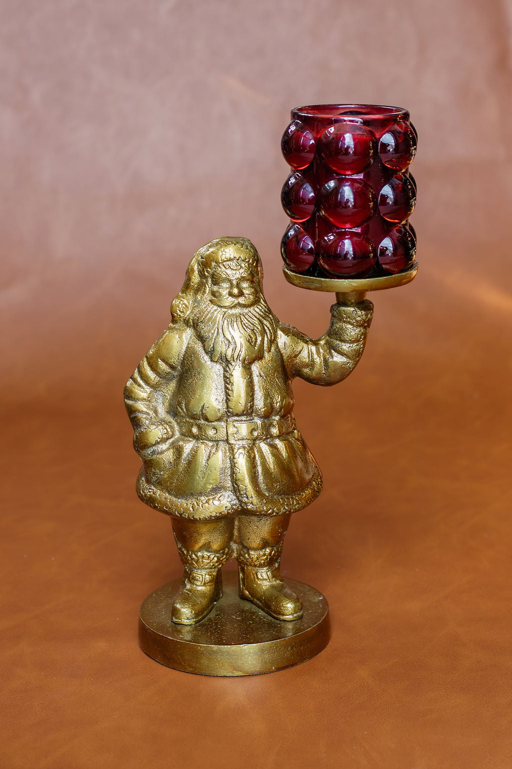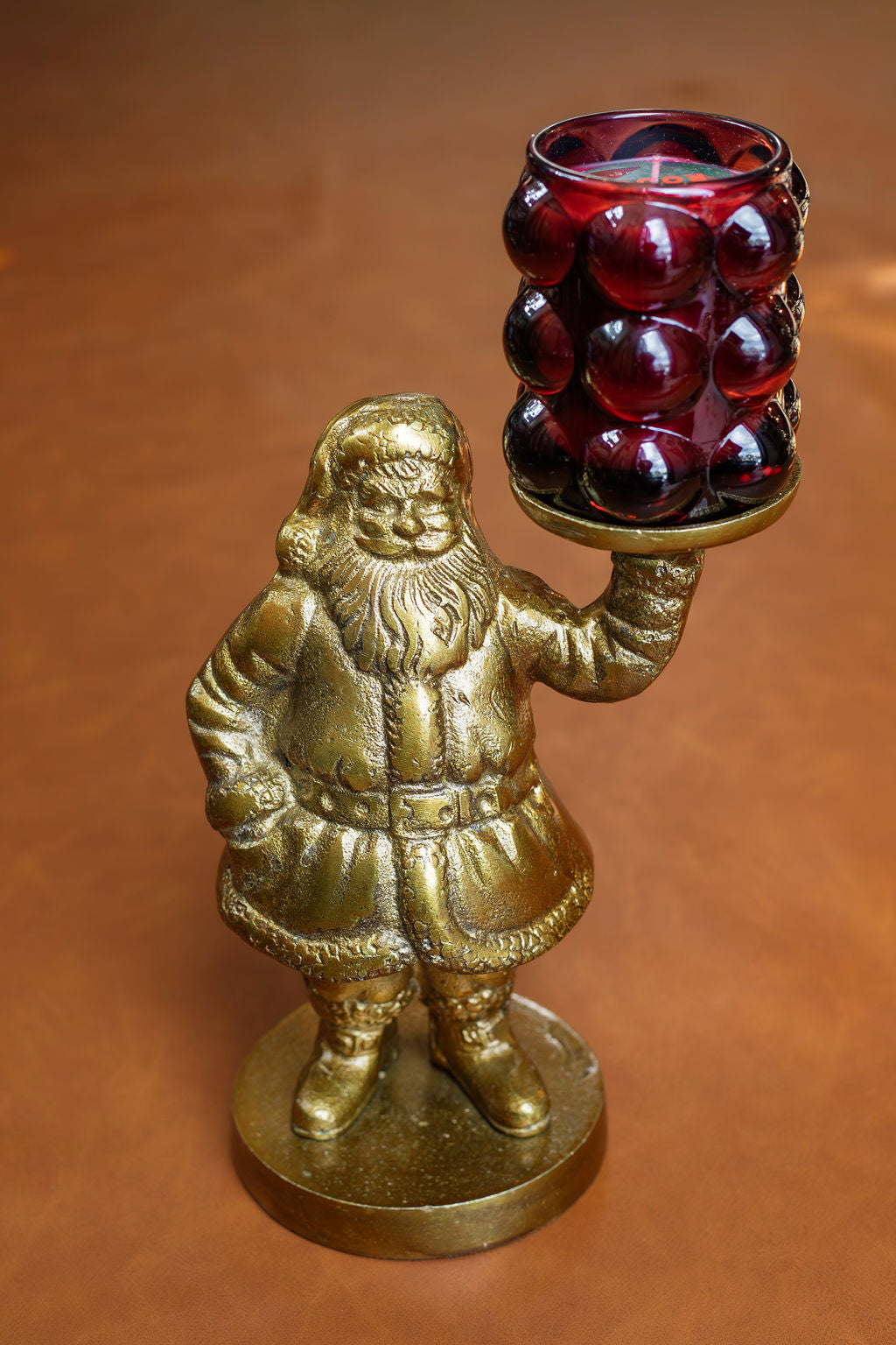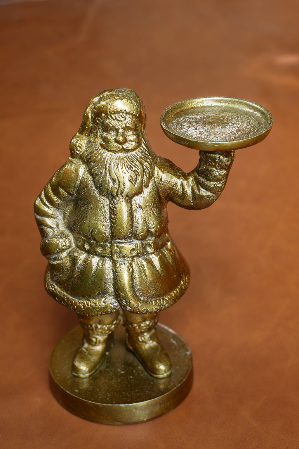 Layer the jolly, elegant, antique gold metal Saint Nick Figurine on a tabletop or mantle with greenery or string lights to bring vintage-inspired holiday cheer. Affixed to his hand is an elevated surface, perfect for a small pillar or votive candle.