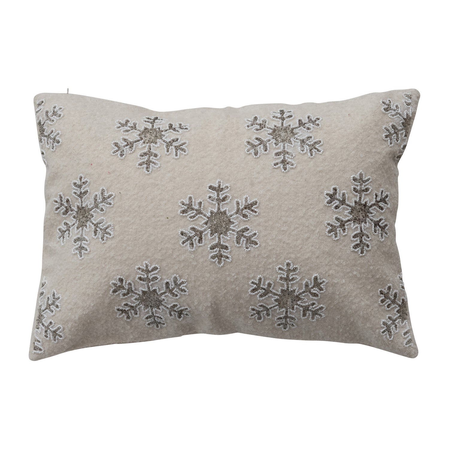 Add a touch of winter magic to your home with this elegant cotton blend lumbar pillow featuring beautiful beaded snowflakes in cream and silver. This seasonal accent piece adds a perfect sparkle to your holiday decor.