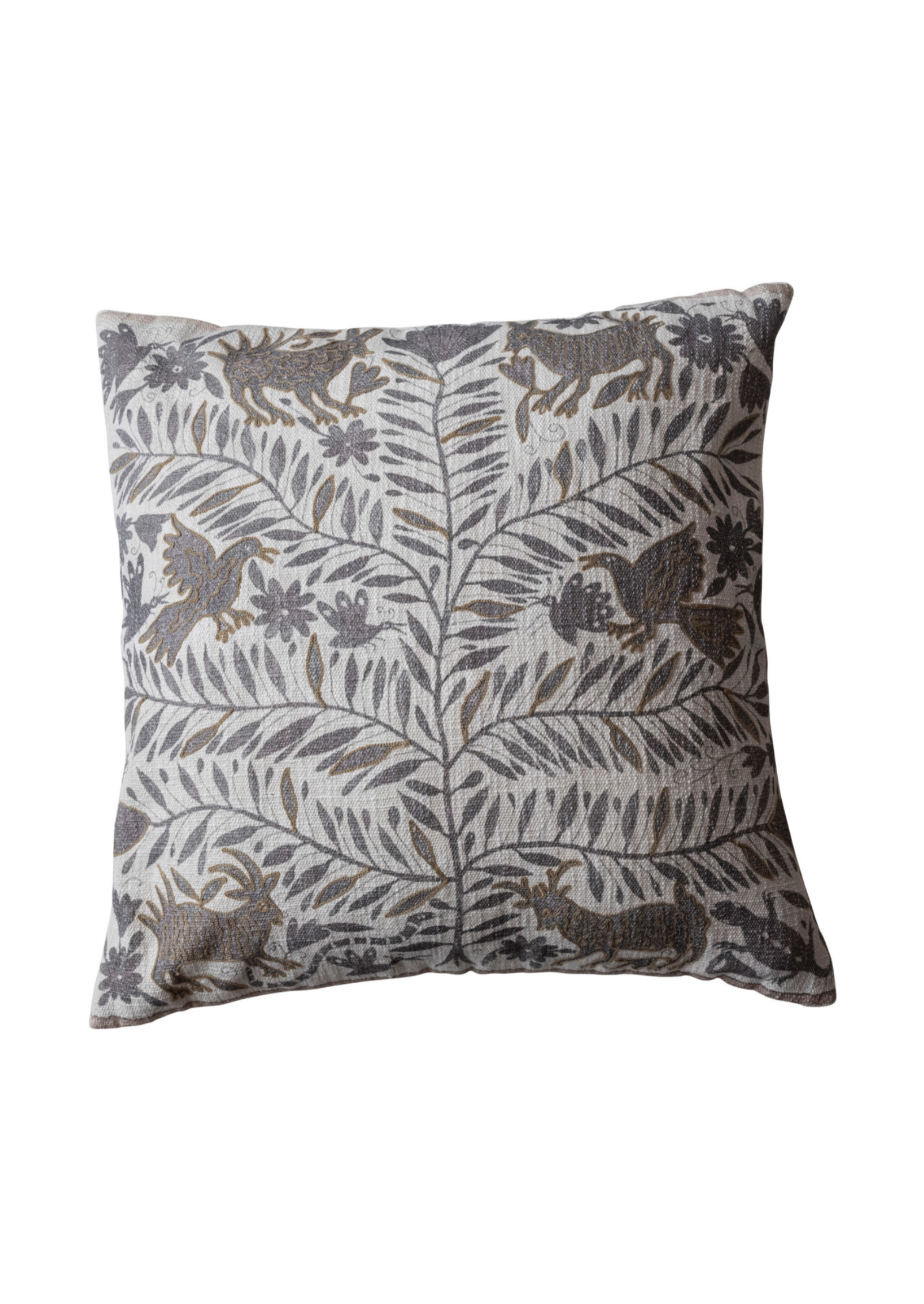 This woven cotton printed pillow showcases the intricate beauty of an Otomi pattern set against a natural, grey, and brown color scheme. The pure cotton cover, paired with a chambray back, offers both comfort and style. Inside, the polyester fill provides resilience and support, ensuring the pillow retains its shape and function. Its square shape and generous size make it a standout piece, perfect for adding a global touch to the home. Whether it's complementing a cozy reading nook or adding an artistic flair to a sofa, this pillow is a celebration of cultural design and comfort. A captivating Otomi pattern graces this woven cotton pillow, featuring a natural, grey, and brown palette for a global-inspired look. An eclectic addition to any decor, this pillow infuses a space with a touch of artisanal charm. A plush polyester fill gives this pillow a full, firm shape.