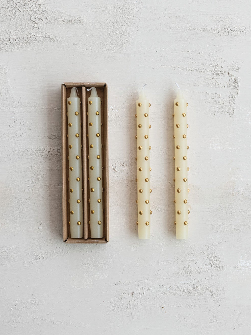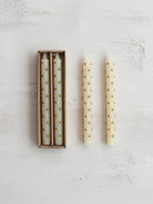 These elegant 10-inch unscented taper candles feature charming 3D gold dots that add a modern twist to classic design. Each candle has an impressive 9-hour burn time, perfect for creating ambiance at dinner parties or holiday gatherings. The unique dotted pattern adds visual interest whether the candles are lit or simply on display.