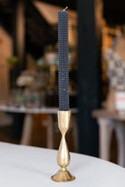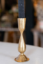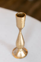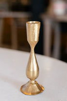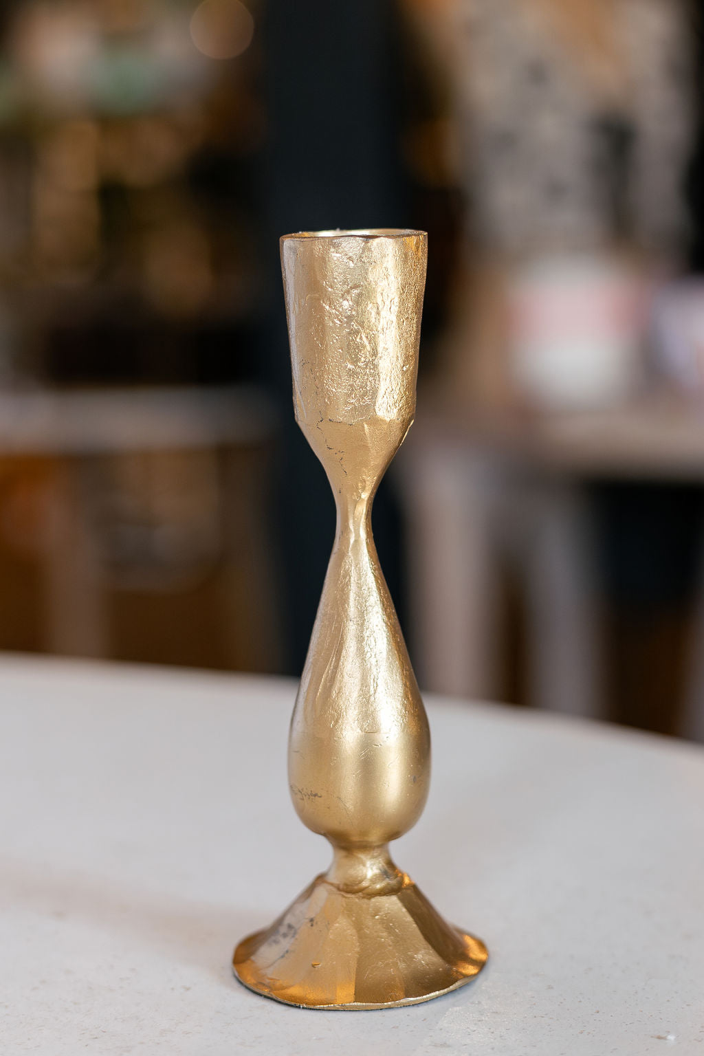 Stylishly designed, this hand-forged, metal taper candle holder has an antique brass finish. An imperfect texture gives it a unique appearance. Display with similar complementary pieces or as a stand-alone piece.