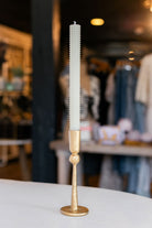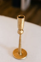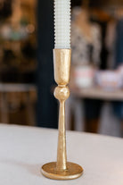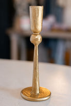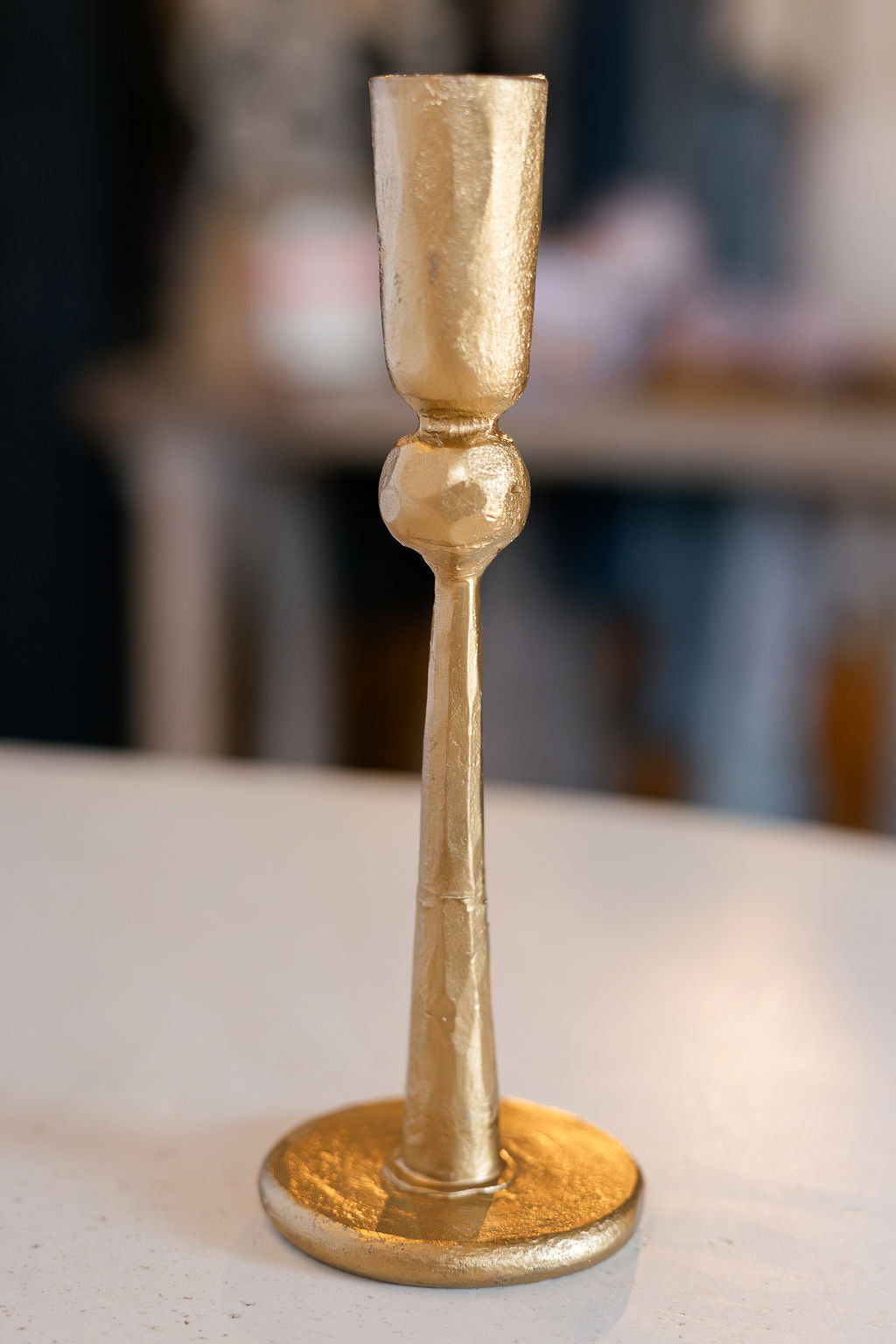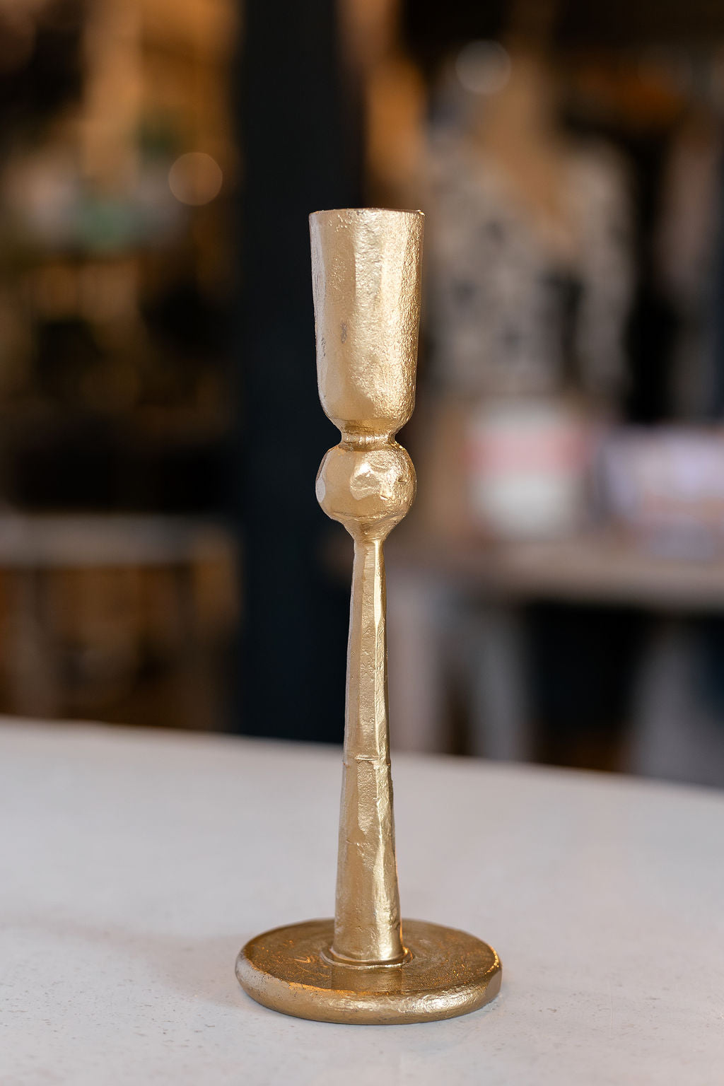 Stylishly designed, this hand-forged, metal taper candle holder has an antique brass finish. An imperfect texture gives it a unique appearance. Display with similar complementary pieces or as a stand-alone piece.