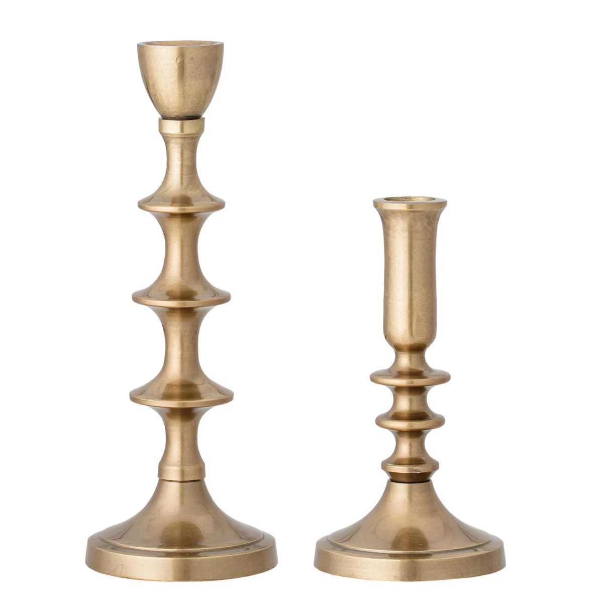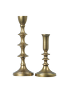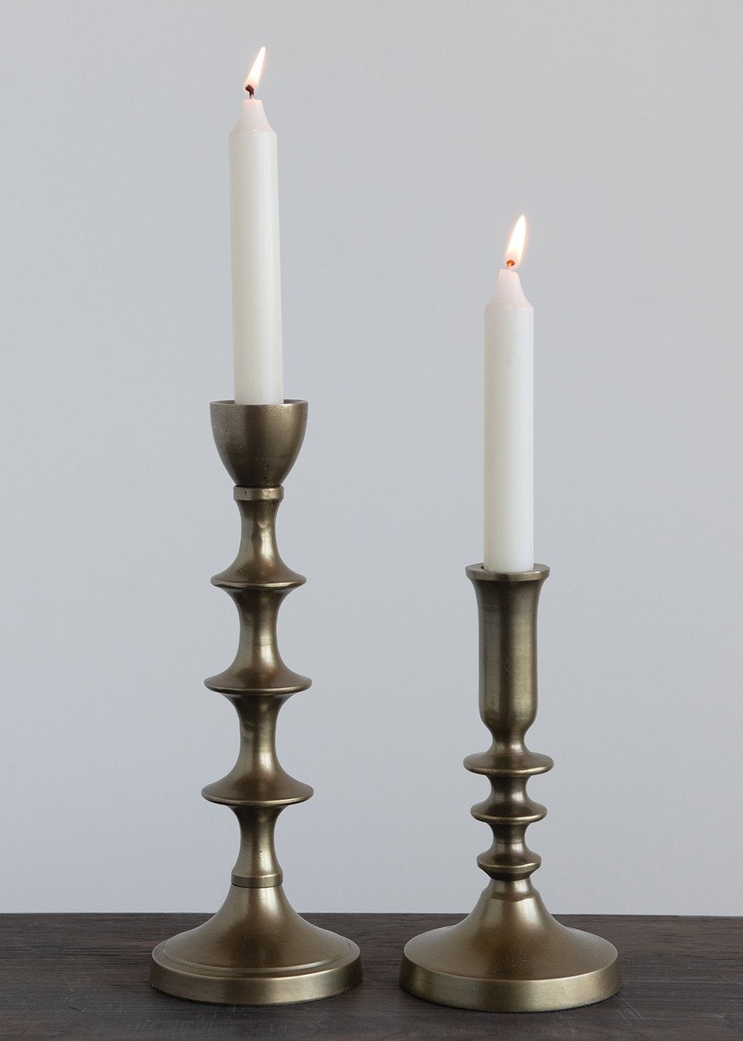 This set of aluminum candle holders is a stunning antique gold color. The patina has a worn and vintage look, as if you picked up this unique candle holder set at a local antique store. Both candle holders have fluted shapes with rounded details. The candle holders hold standard taper candles.