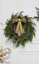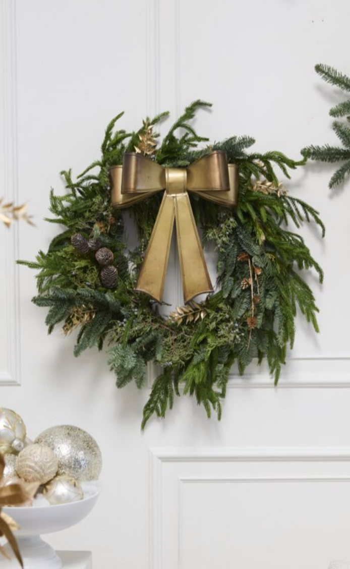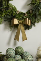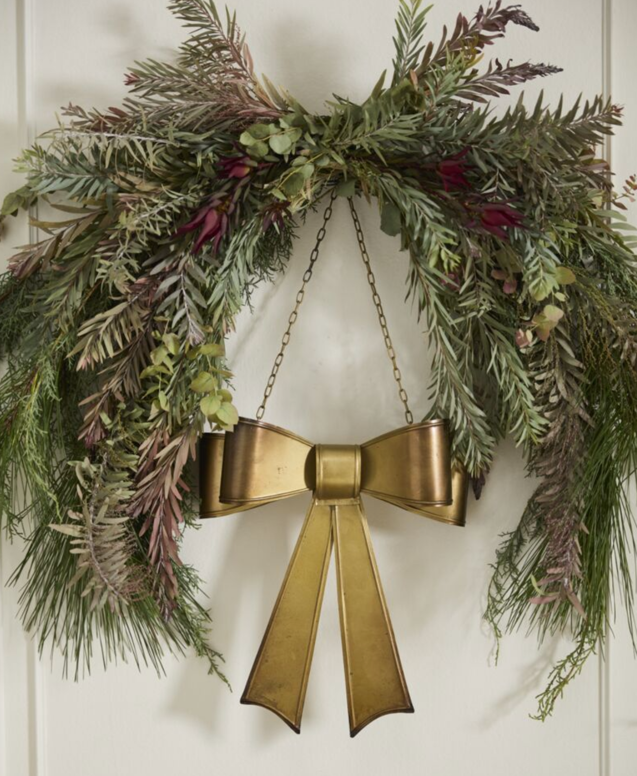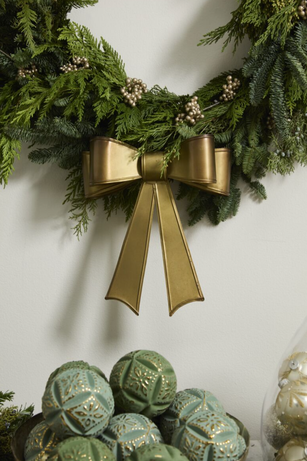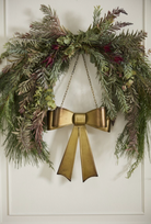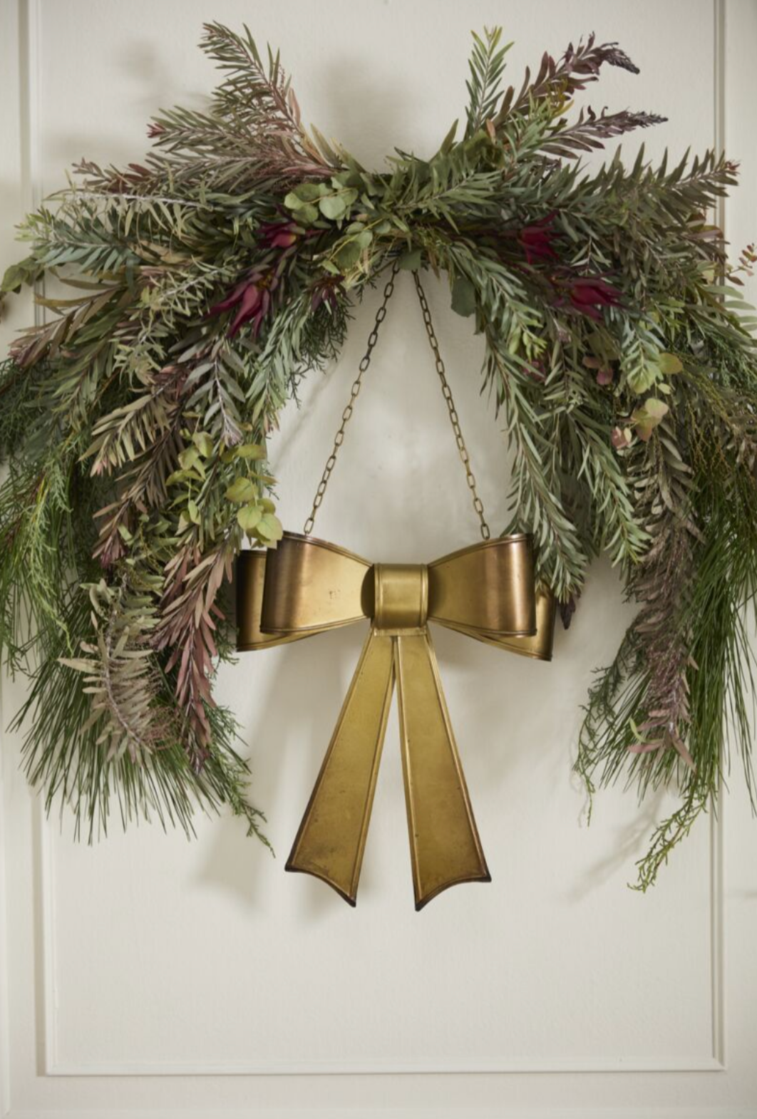 Create a festive and inviting entryway with the Bow Wreath, a lightweight, large-scale metal bow with an aged brassy finish. This classic bow hangs from a gold chain and can be styled as a singular piece, or looks stunning layered onto a fresh wreath of greenery. Double layered loops give this style lots of dimension and the aged finish is a nostalgic nod to vintage holiday decor. We recommend styling on a door that has an overhead covering or bringing this beautiful bow inside for a fresh holiday display!