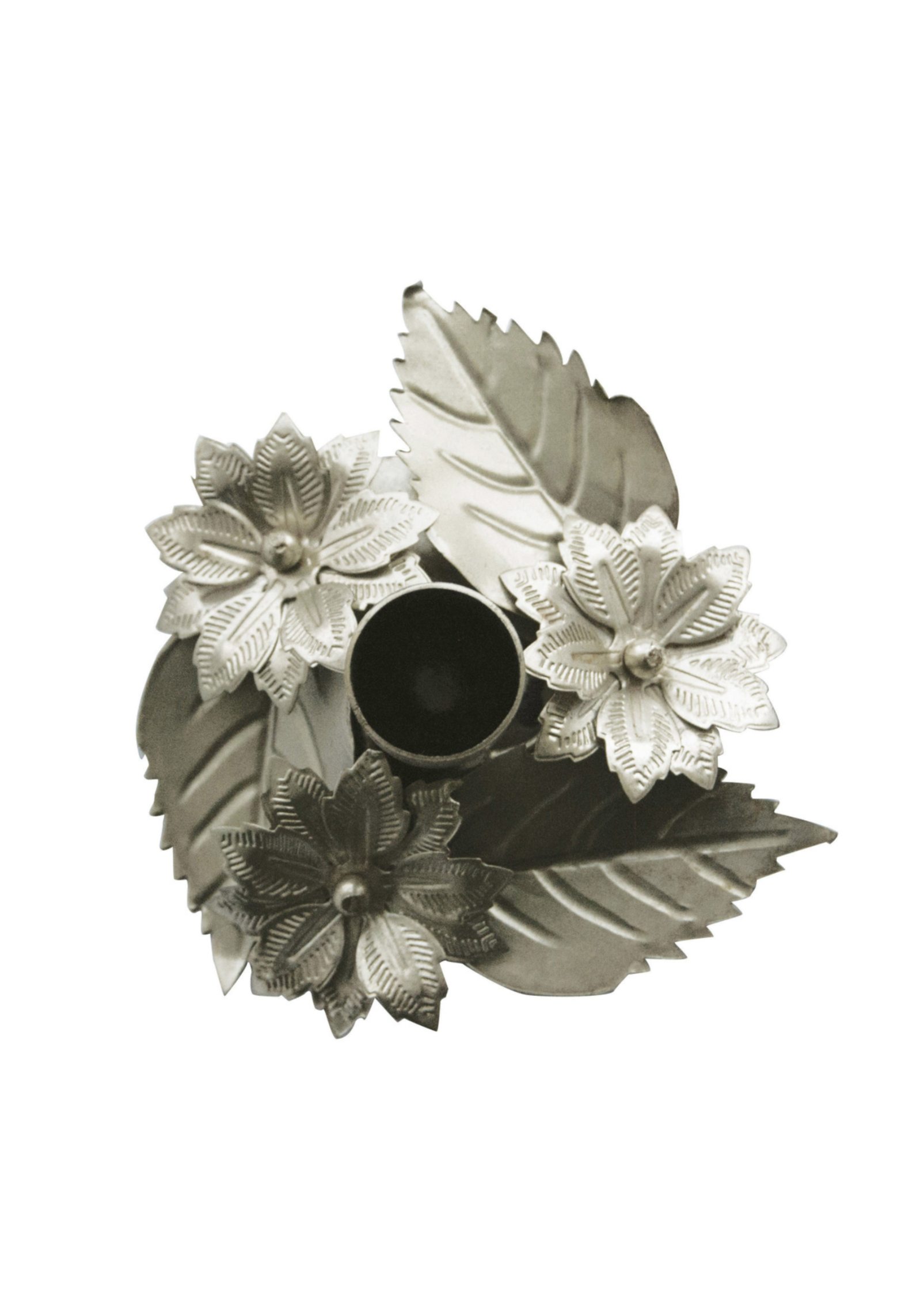 Add a touch of holiday cheer with this metal taper holder featuring poinsettias and leaves in a distressed pewter finish. Perfect for adding a festive touch to any room or as a centerpiece for any holiday gathering. Spread the joy (and candles) with this quirky and playful decoration!