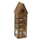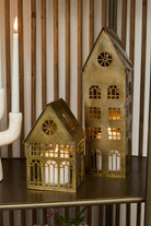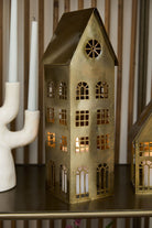Crafted from sheet metal with a brassy finish, these charming houses feature cutout windows and doors for a cozy, illuminated effect. Perfect for styling with lights, these lightweight pieces look stunning on shelves or mantles. Pair the large and small Township Houses together among greenery, tree figurines, and "snow" batting for a beautiful, wintry scene.
