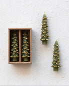 This charming 4-3/4" tree-shaped taper candle features a rich evergreen color and elegant gold tips. Perfect for holiday decorating, this unscented candle offers 3 hours of burn time and adds a festive touch to any setting.