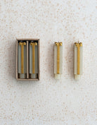 Bring whimsical charm to your holiday decor with these unique gift package-shaped taper candles. Standing 4-3/4" inches tall, each cream-colored candle features an elegant gold bow detail and provides up to 6 hours of burn time. Parrafin wax.
