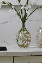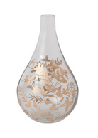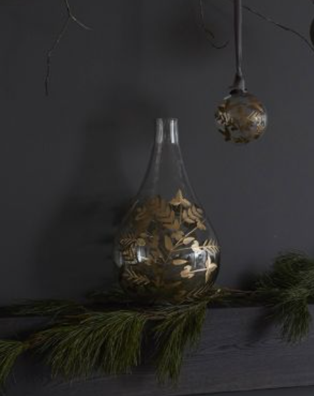 Statement making on its own, the Gild Leaf Vase is a large scale bulb shaped vase that has tapered neck, and gold etched leaves on a clear base. Styled with branches and fresh florals, this vase makes a lovely centerpiece for a holiday table.