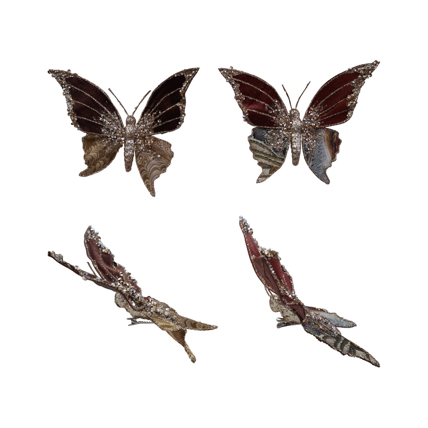 Add a touch of beauty to your holiday decorations with these charming butterfly bug clip-on ornaments. Featuring beautiful jacquard and velvet materials adorned with sparkling glitter details, these ornaments come in two delightful styles. These unique decorative pieces easily clip onto trees, wreaths, or garlands for an enchanting seasonal display.
