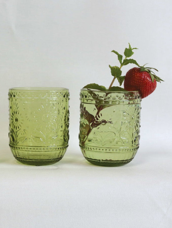 This elegant 12 oz. embossed drinking glass features a classic round shape and green color, perfect for everyday use or special occasions. The durable glass construction is food safe and designed to last, making it an ideal choice for any home.