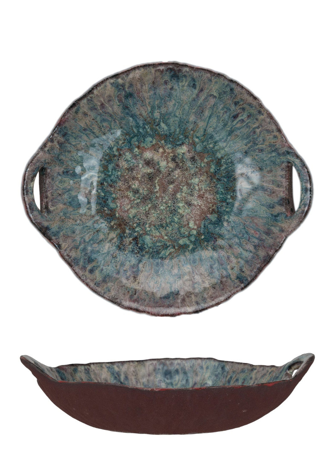 This Cosmic Hues Stoneware Bowl with Handles is a functional work of art, perfect for the modern home. The dark, multicolored reactive glaze gives each bowl a unique, celestial appearance, reminiscent of a starry night sky. With dimensions of 10.75 inches in length, 9.50 inches in width, and 2.50 inches in height, it's generously sized to hold a variety of dishes, from casual family dinners to elegant soirées. The added convenience of handles makes serving a breeze, while the food-safe glaze ensures that it's as practical as it is beautiful. Whether used daily or reserved for special occasions, this bowl is sure to captivate and serve with style.