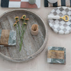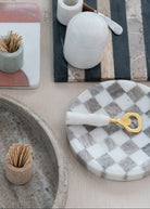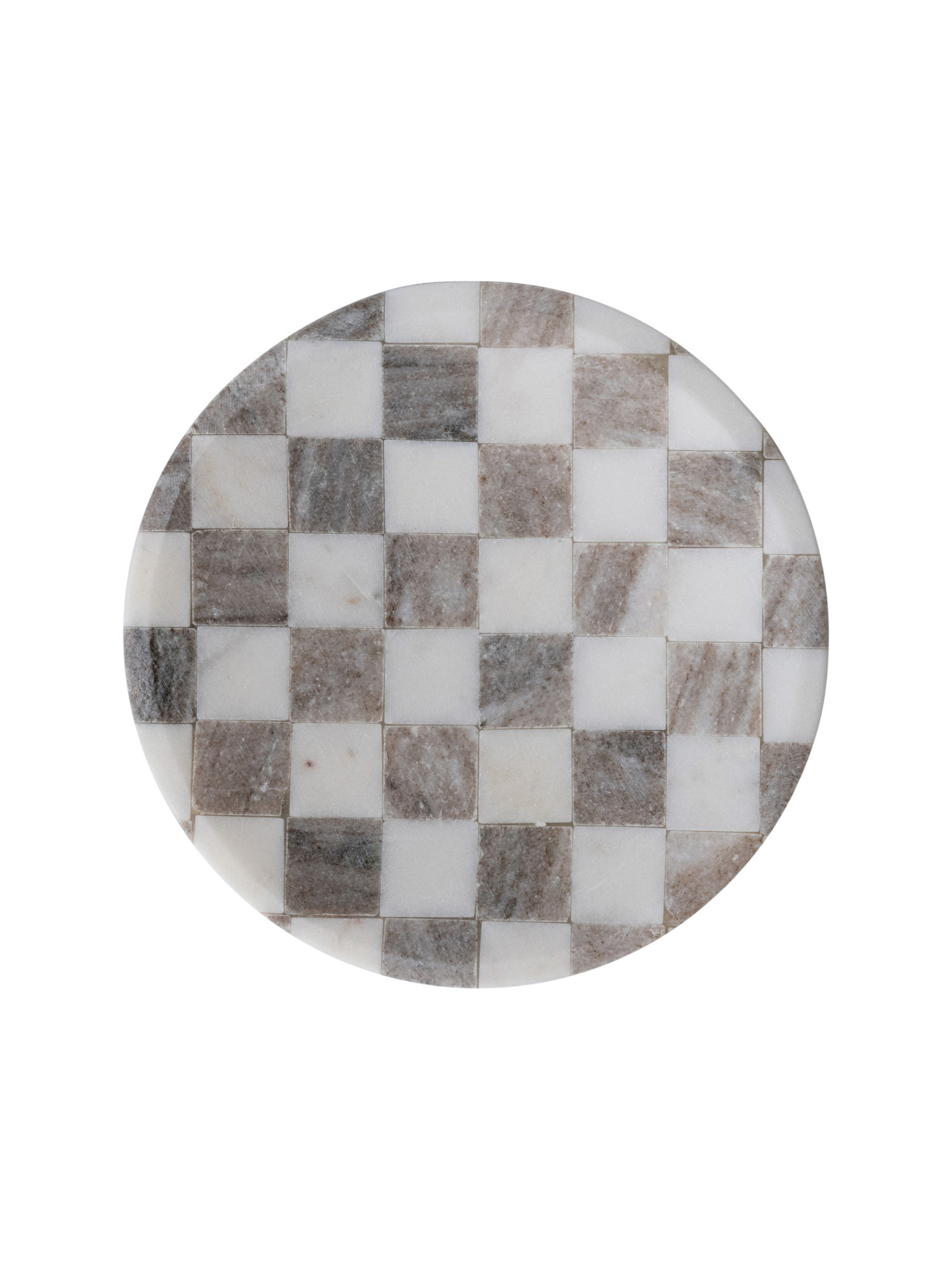Upgrade your charcuterie game with this Marble Checkered Cheese/Serving Tray, featuring a unique mix of buff color and white.