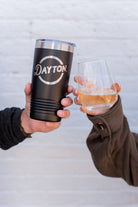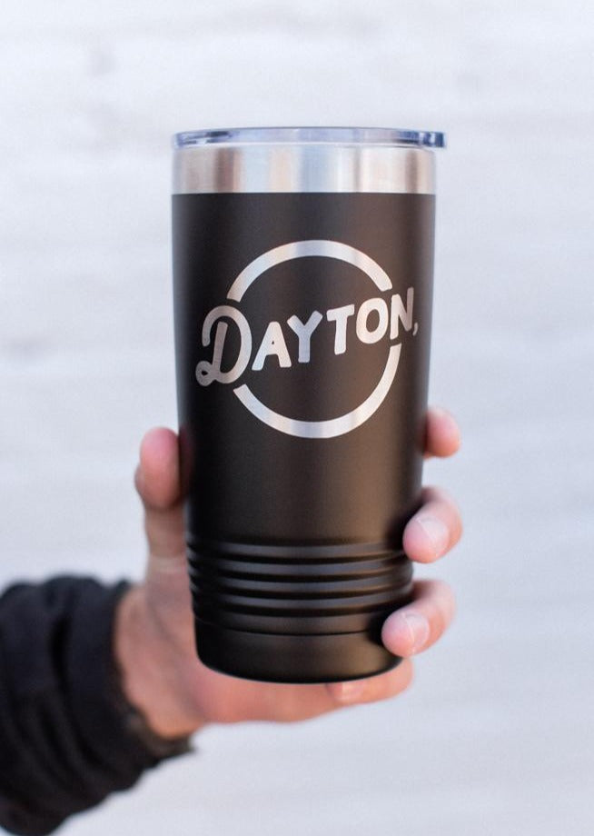 Represent Dayton, O in style with this black stainless steel coffee tumbler - guaranteed to be your new favorite. Fits car cup holders and keeps your drink temp controlled.