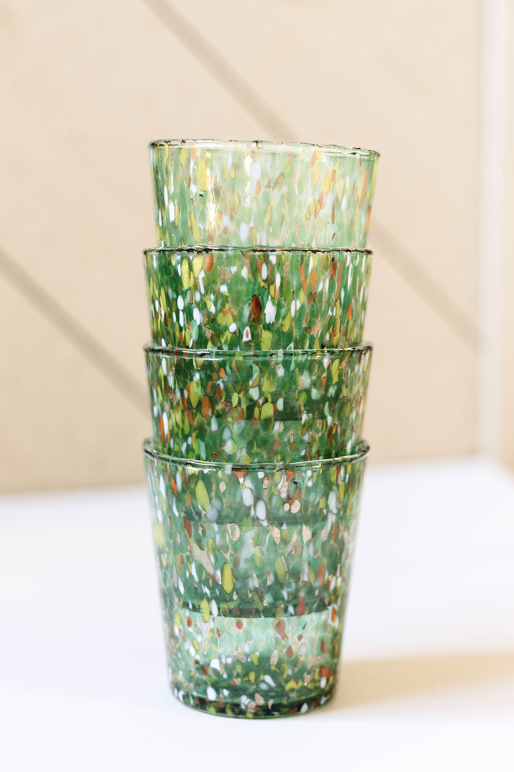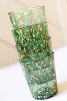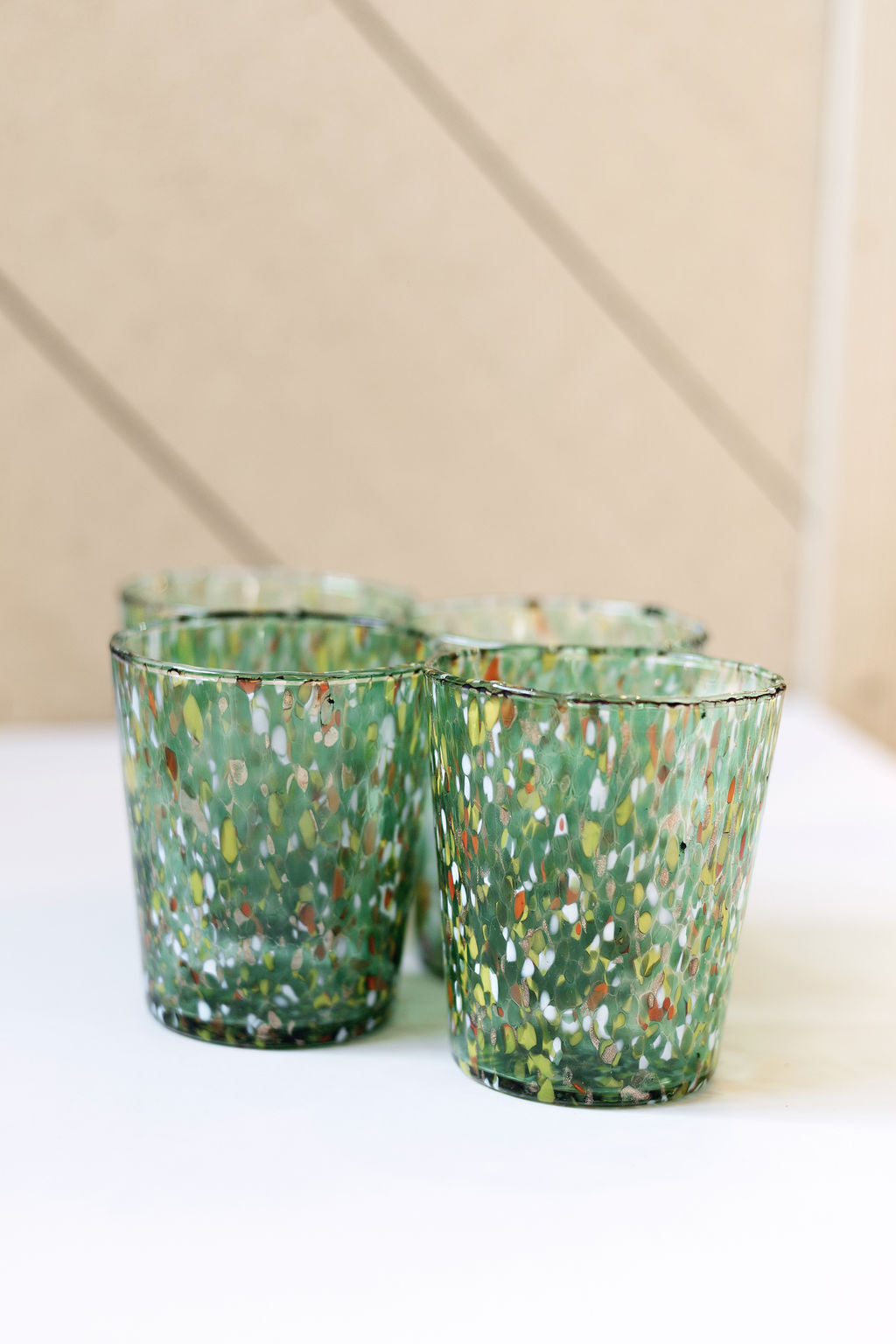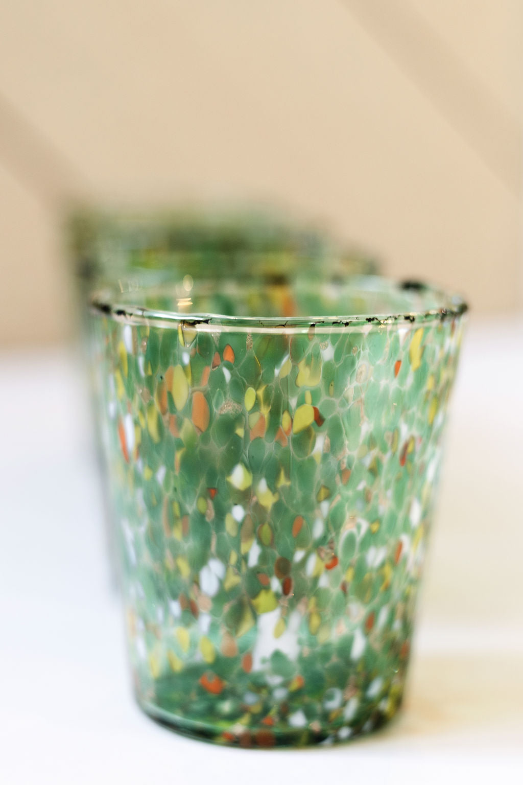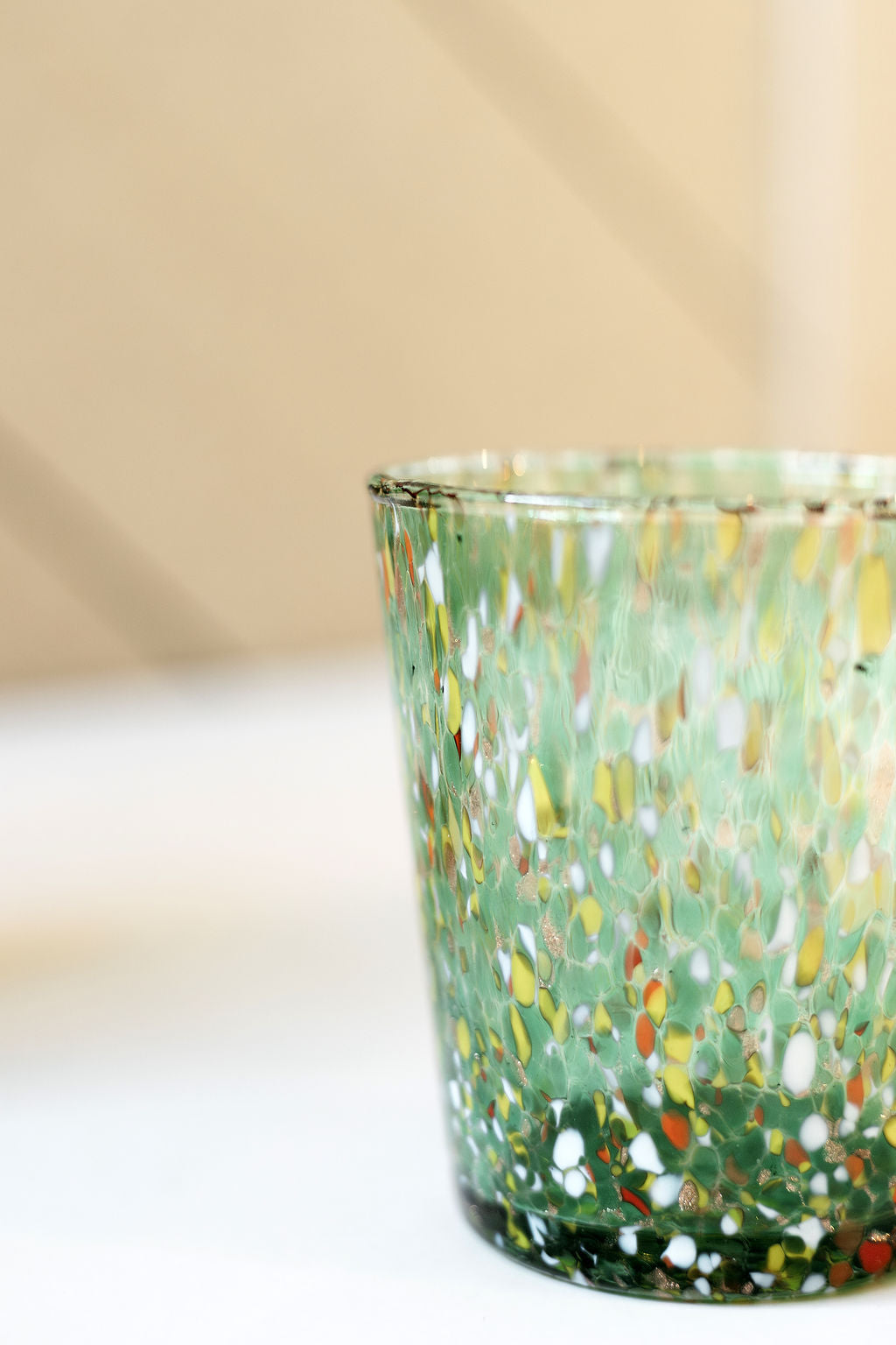 Sip in style with our Hand-Blown Recycled Confetti Drinking Glass! Made from recycled materials, each glass features unique multicolor confetti and a touch of gold glitter. Use as a drinking glass or votive holder for a playful and eco-friendly touch to your home. Cheers!