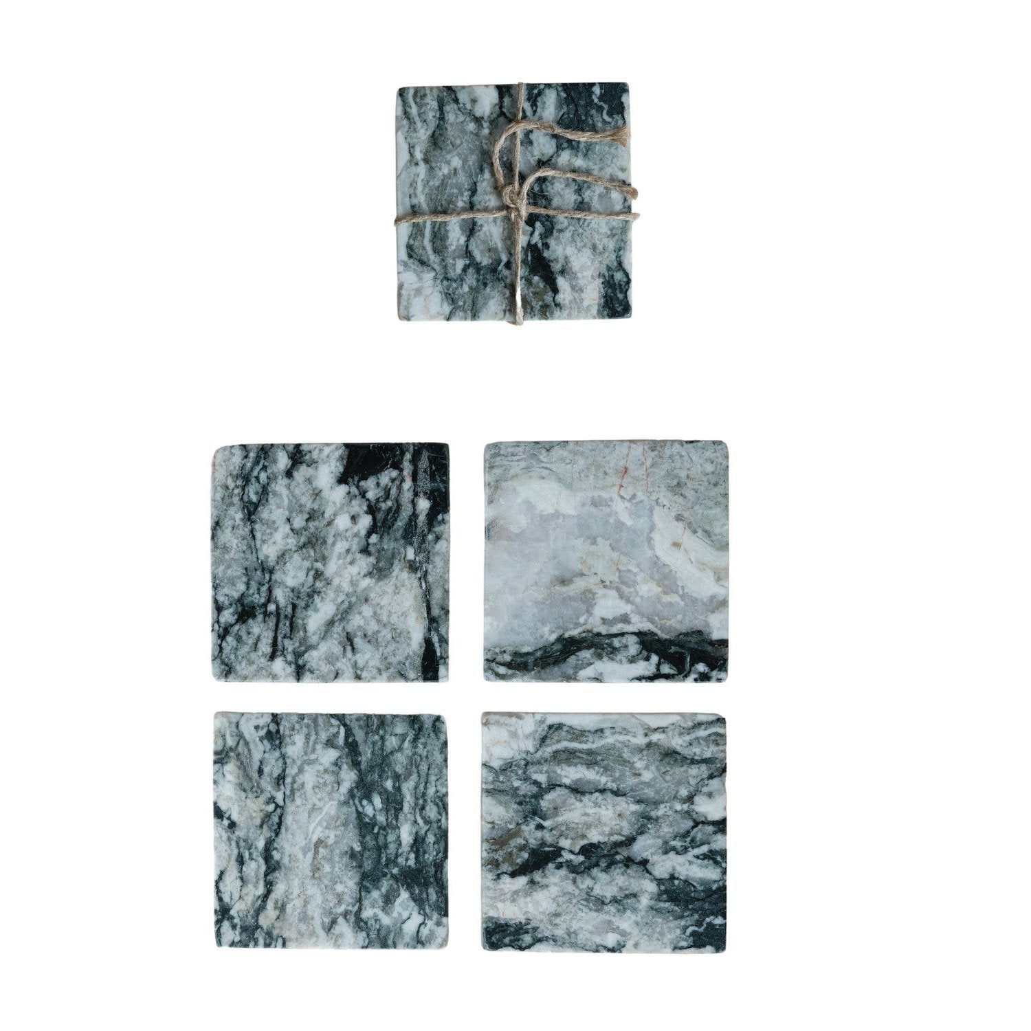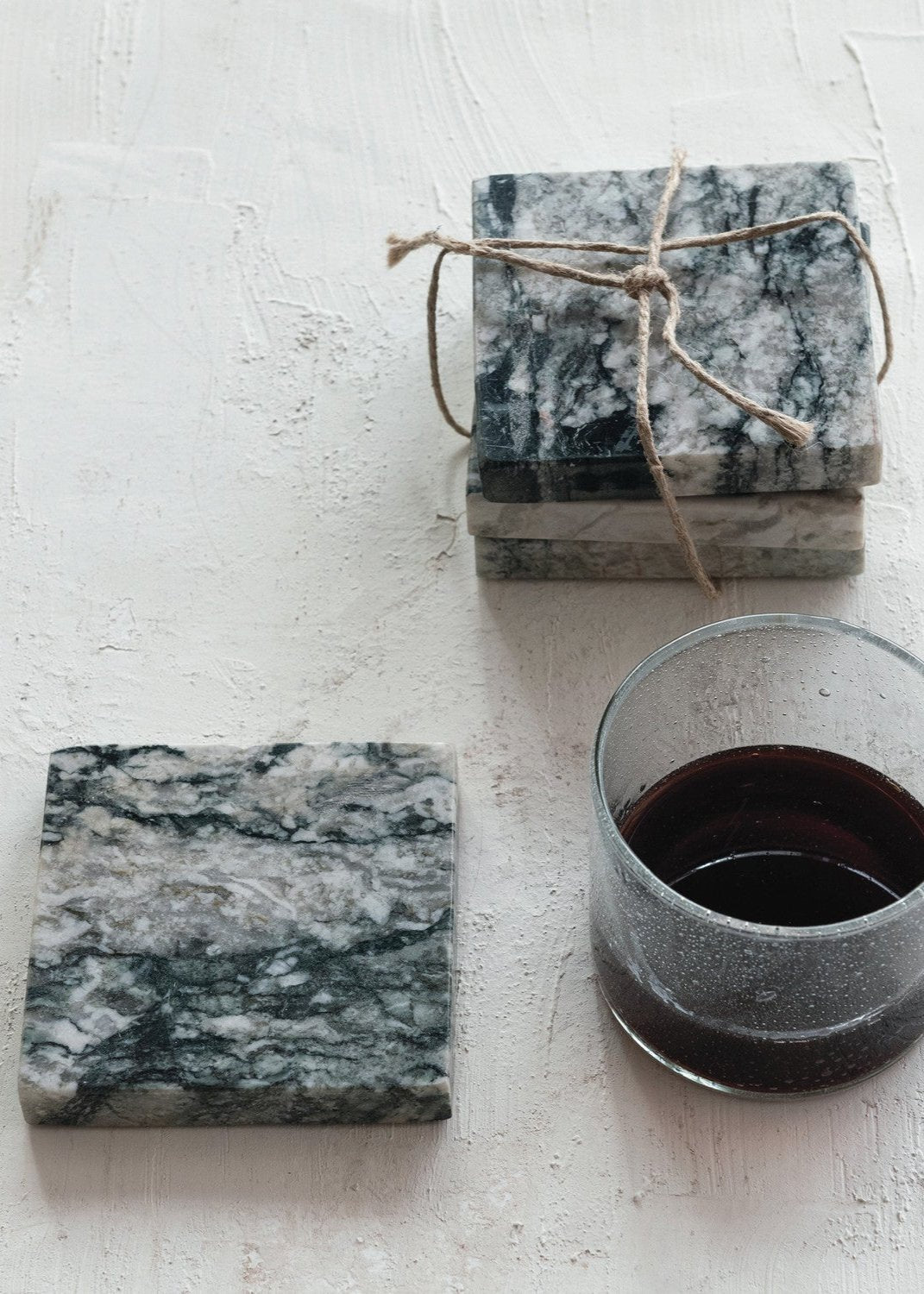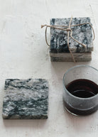 This set of 4 Square Marble Coasters in a striking black mélange pattern is both practical and aesthetically pleasing. The coasters' square shape and solid marble construction ensure stability for the drinks, while the natural veining provides a unique backdrop for each coaster, making them as individual as they are functional. It measures 4 inches square, offering ample space for a variety of glassware. Ideal for a range of interior styles, from modern to boho to minimalist, they bring an element of refined taste to the coffee table or dining experience. Not only do they serve the purpose of protecting surfaces, but they also add a decorative touch that complements any room's theme.