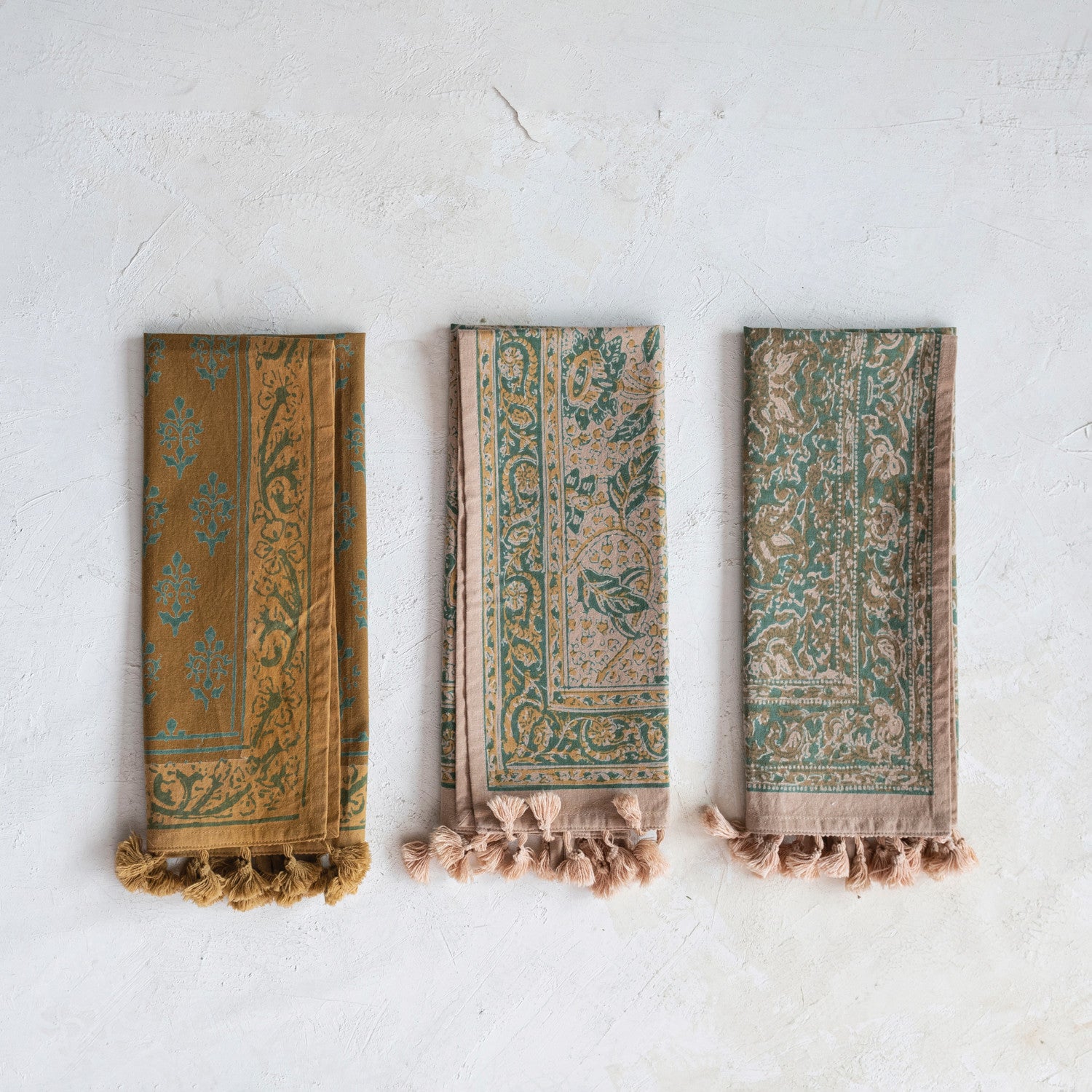 Featuring a vast selection of lush woven textures, intricate details, and timeless patterns, our collection of kitchen textiles will bring warmth and elegance to a dining space of any style. Instantly transform a breakfast nook or dining room into a sophisticated sanctuary by exploring a vast array of textiles and accessories fit for any space including table runners, napkin sets, placemats, napkin rings, tea towels, dish cloths, sponge cloths, pot holders, food pouches, aprons, and so much more. This boho-inspired set of cotton tea towels features unique botanical prints, decorative tassels, and hanging loops. Display in a living or dining space of any style from global to cottage. Spot Clean Only. Made from cotton.