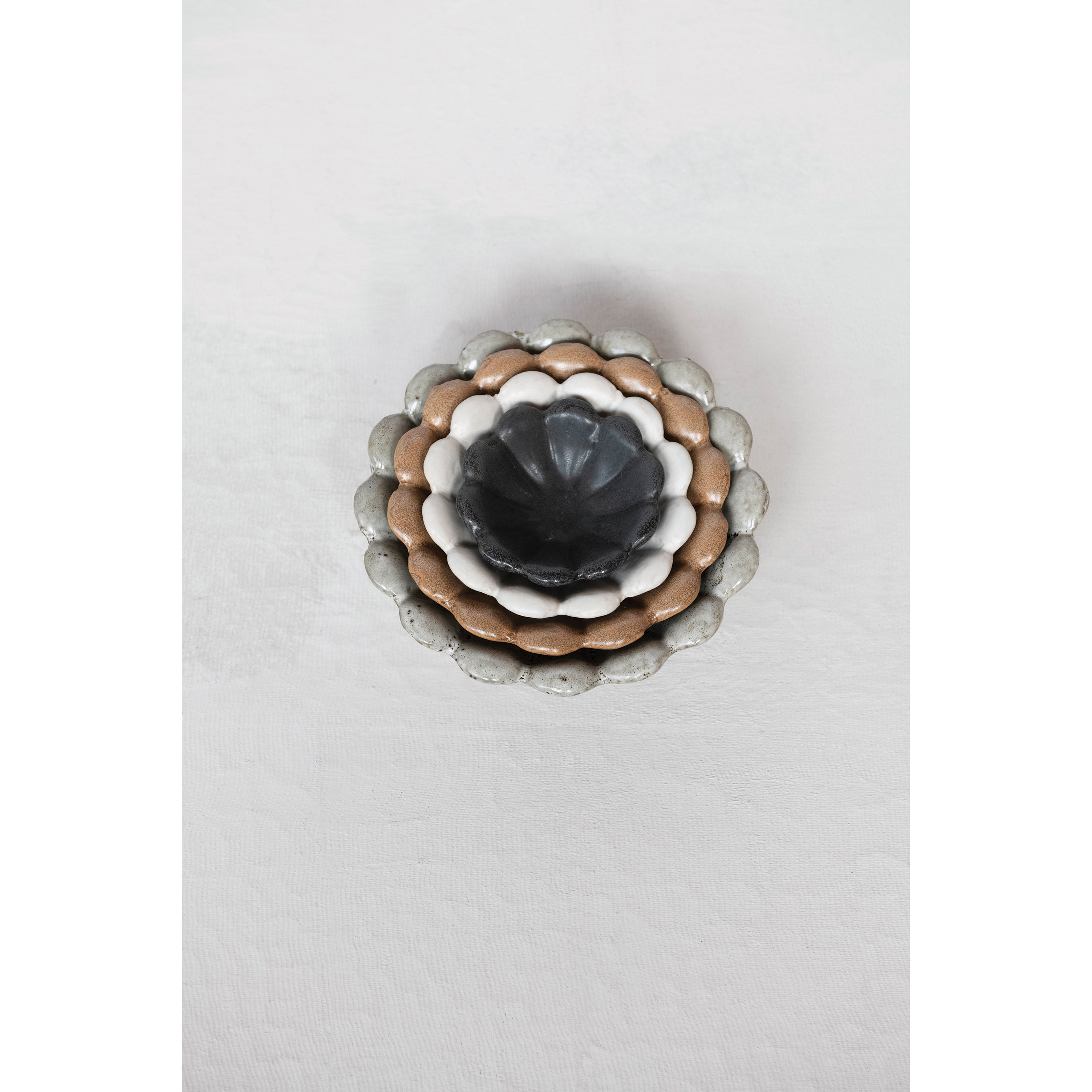 This delightful set of four flower-shaped stoneware bowls adds both function and whimsy to your home. Each bowl features a unique reactive glaze finish with neutral colors, making them perfect for storing keys, rings, jewelry, or other small treasures. The charming flower shape and varying sizes make this set an eye-catching display piece for any room.