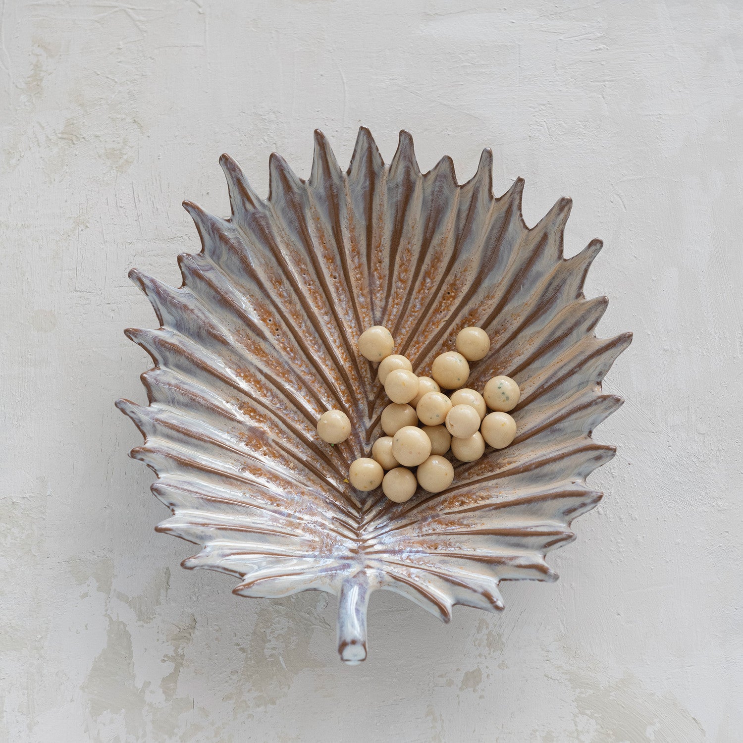 Bring tropical elegance to your table with this stunning stoneware palm frond-shaped bowl featuring a beautiful reactive glaze finish. Each piece is hand-crafted with variations in color, making every bowl truly unique. The natural palm frond form combines functionality with artistic appeal, perfect for serving or display purposes.