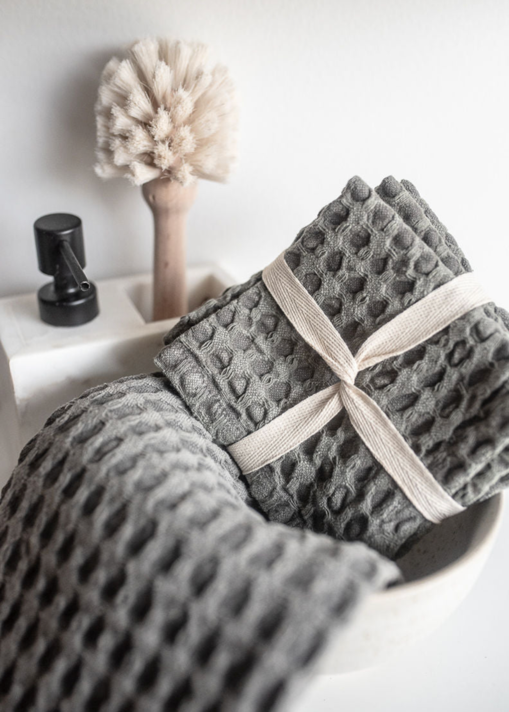 Add warmth and elegance to your kitchen with this classically designed stonewashed cotton tea towel. Featuring a stylish waffle weave texture and a sophisticated charcoal shade, this versatile towel complements any kitchen décor from Scandinavian to farmhouse styles. Made from durable, softened cotton that becomes even softer with every wash, it's both functional and beautiful.