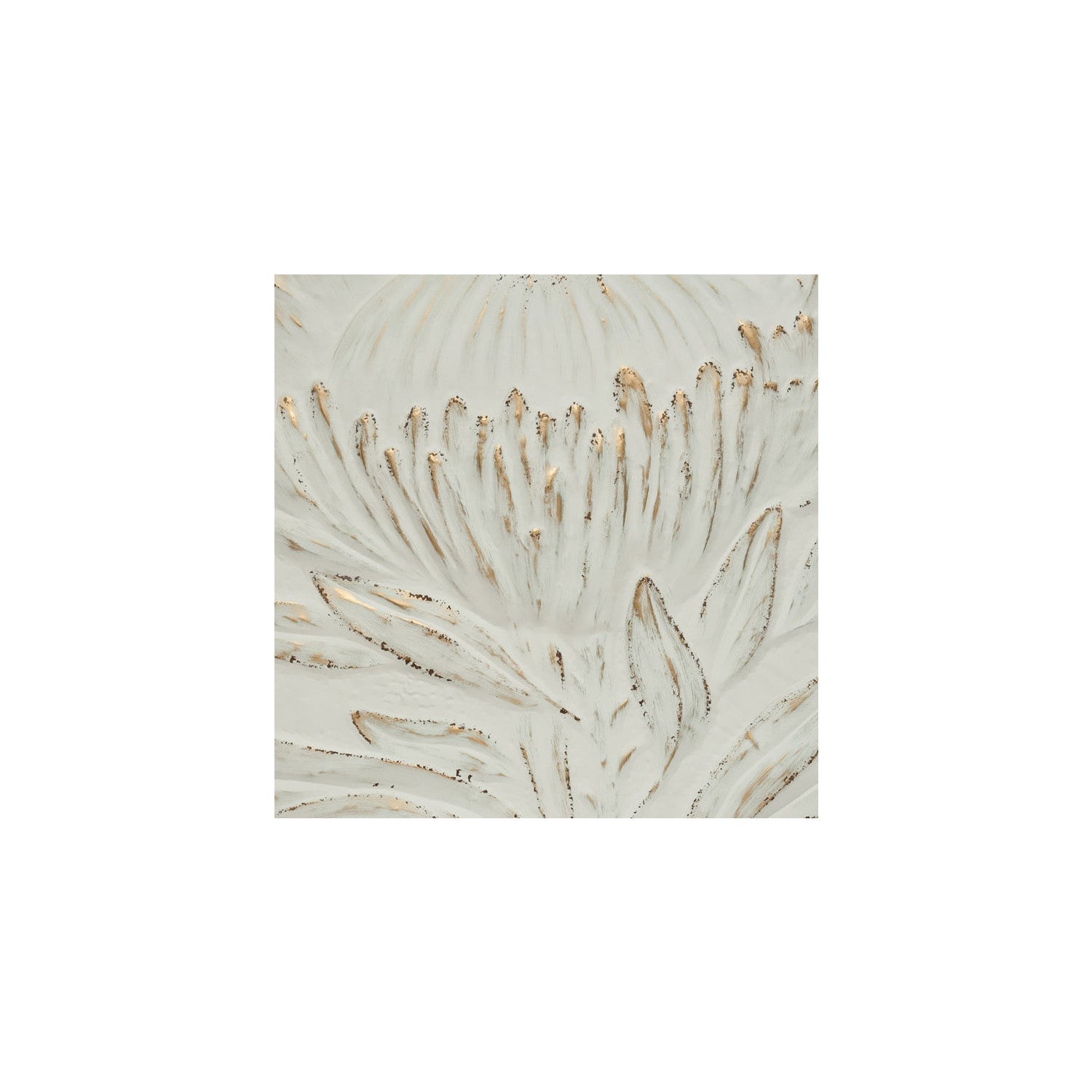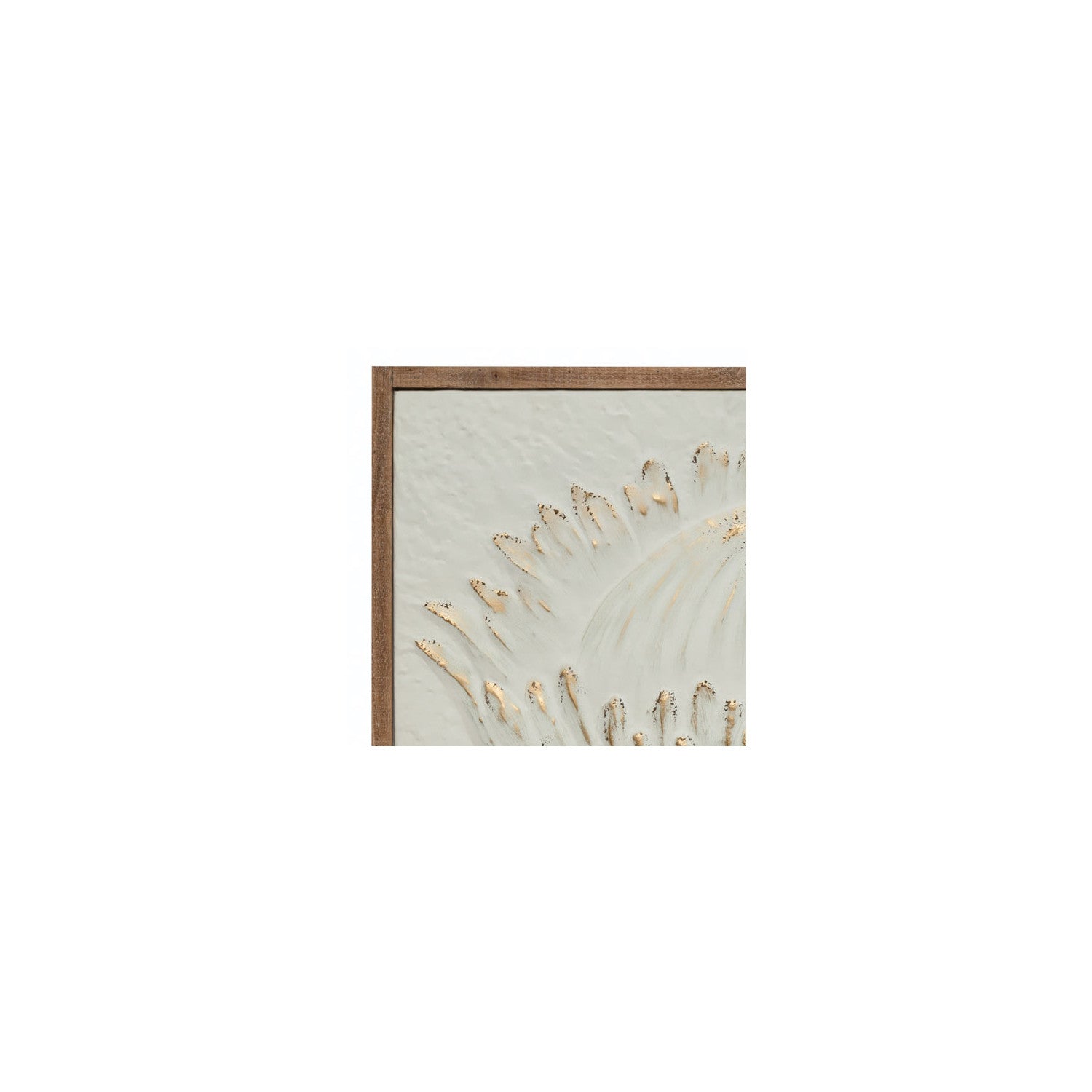 Add some elegance and texture to the walls with this protea metal wall decor that features an embossed floral design in antique white and gold. This wall decor is perfect for any style of home decor, especially if rustic, or boho look. The wall art has an integrated hanging mechanism that can easily hang it vertically. This wall decor is made of fir wood and metal.