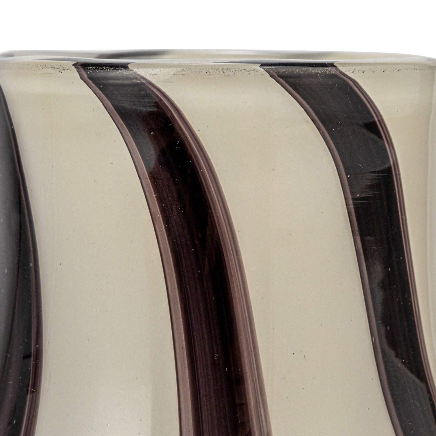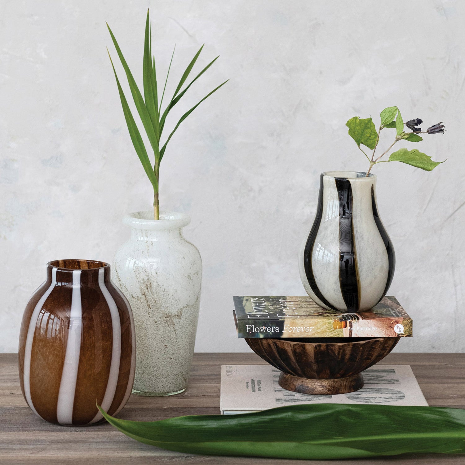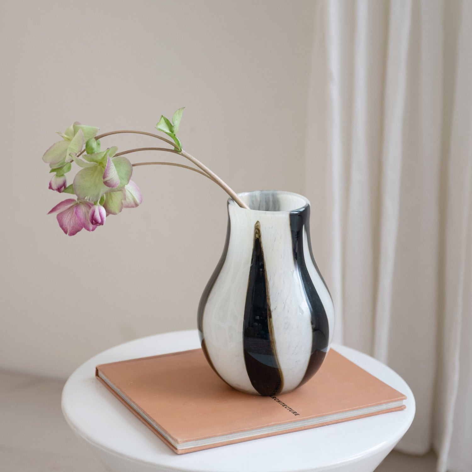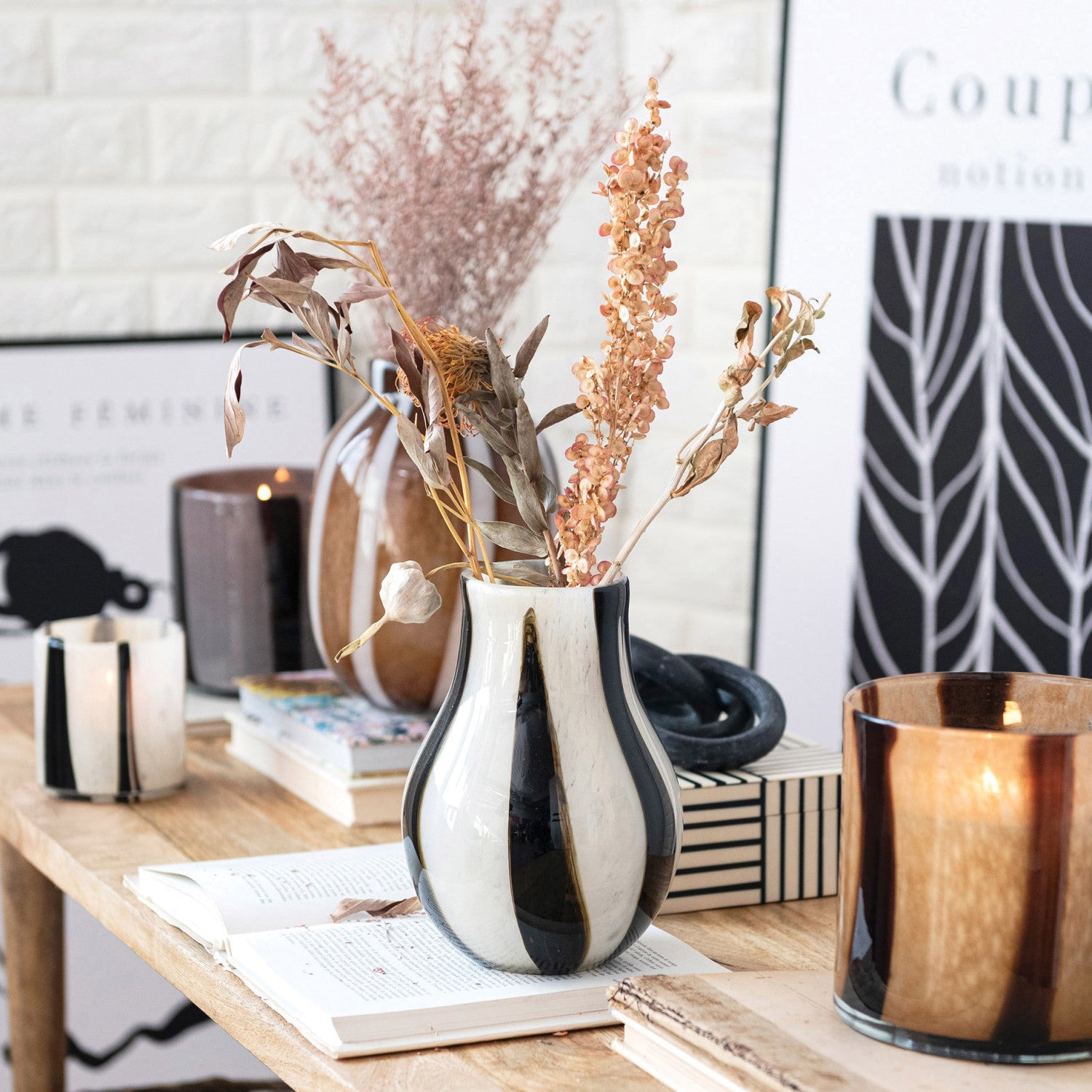 Crafted from high quality glass with a sleek and transparent finish that beautifully complements the bold striped pattern, this stylish round vase features a striking design with black and white stripes that create a visually dynamic and contemporary aesthetic. Whether used as a centerpiece, displayed on a shelf, or as a decorative accent, this vase exudes contemporary elegance and showcases any floral creativity with style. The 2.75-inch round opening provides ample space for arranging and displaying any favorite blooms, making it easy to create stunning floral displays for any occasion. Made of glass.