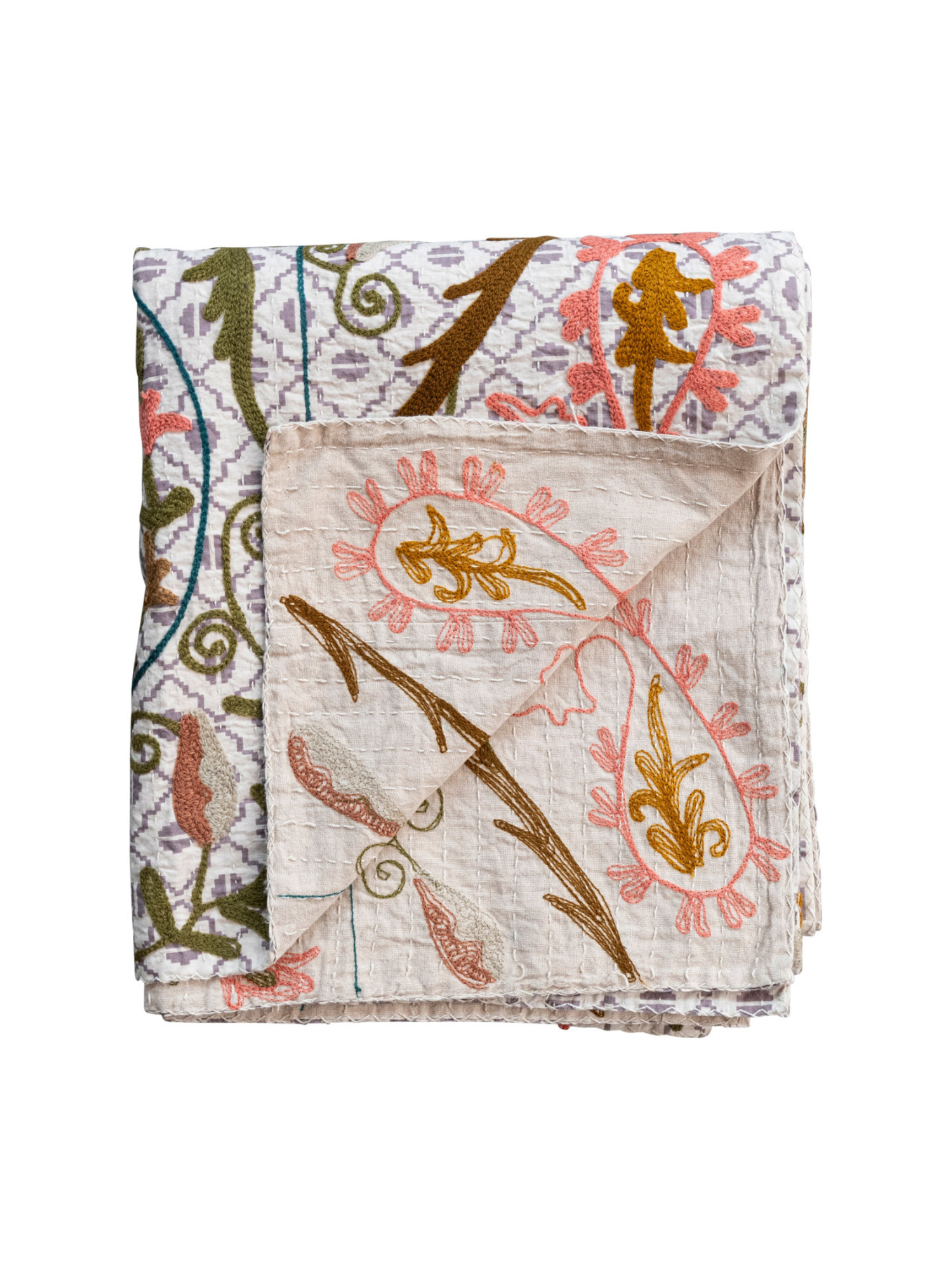 Add some beauty and elegance to the living space with this stonewashed printed cotton voile throw. This stonewashed printed cotton voile throw is a beautiful and elegant addition to any living space. It features a soft, smooth feel, a stunning floral pattern, a hand-embroidered kantha stitch, and a chambray back in multiple colors. Curl up on the couch, snuggle in bed, or relax on a chair with this throw to keep warm and comfortable. It measures 60 inches in length and 50 inches in width, making it a generous size for covering up. The throw's beauty and elegance make the home more inviting and cozy, making it a perfect addition to any space.