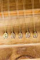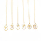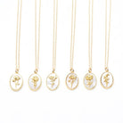 The sweetest birth flower charm necklaces featuring gold birth flowers on a faux mother-of-pearl and gold bezel.