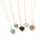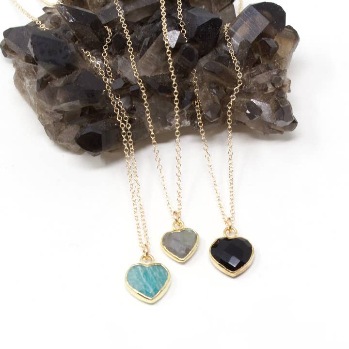 Super sweet gold-edged gemstone hearts hang on a 14kt gold-fill chain to create this perfect gift idea. Gemstones is Moonstone. Size of gemstones may vary slightly. Chain is 14kt gold-fill and measures 18''.