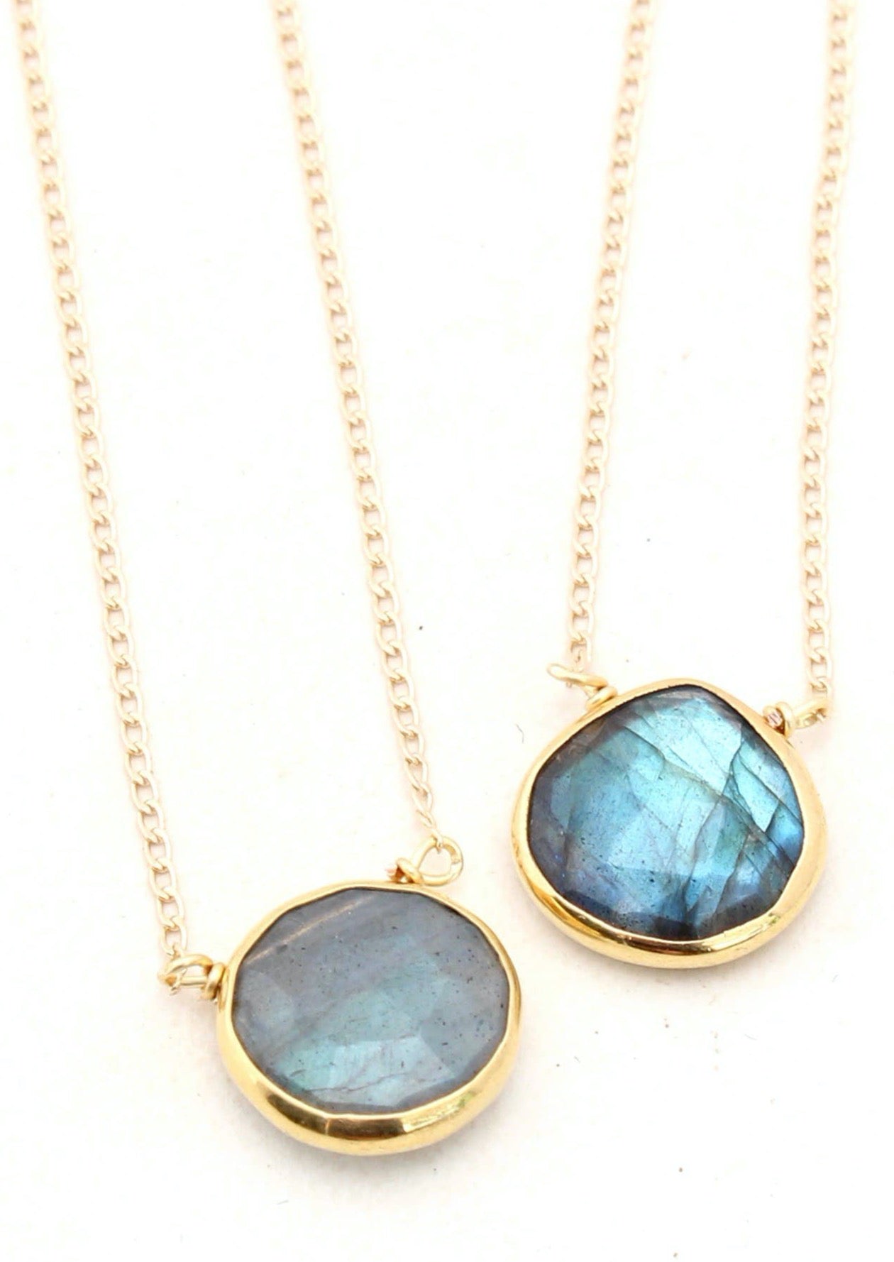 Stunning flash and a petite chain make this short necklace a stunner! In first product photo, the circle shape is pictured on the left and teardrop is on right. Please note, the size of the gemstones will vary, based on availability -- most range from 10-20mm. Gemstone is Labradorite. Chain is gold-fill and measures 18''.