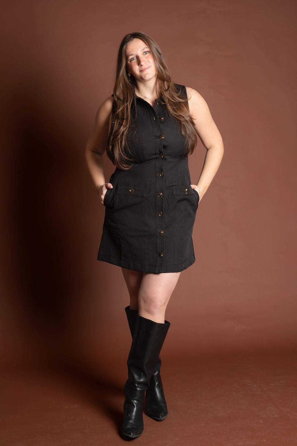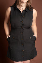 Solid sleeveless mini dress featuring front button closure and non-functional flap detail at front. Side pockets. Lined. Woven. Non-sheer. Lightweight.