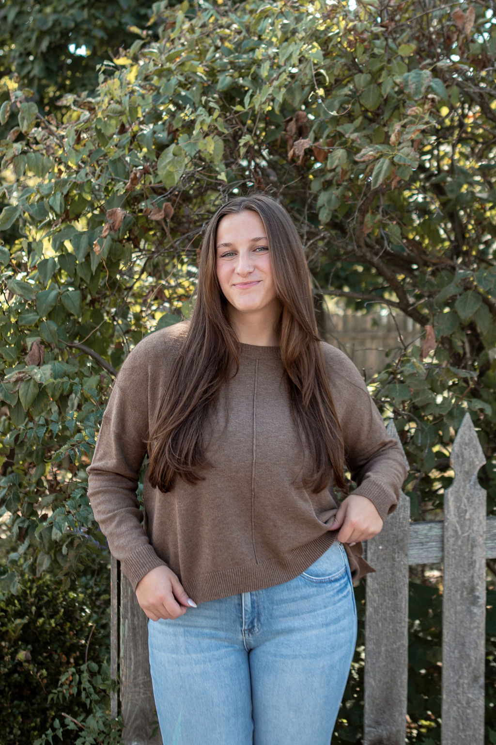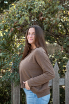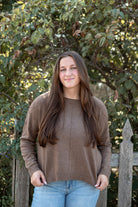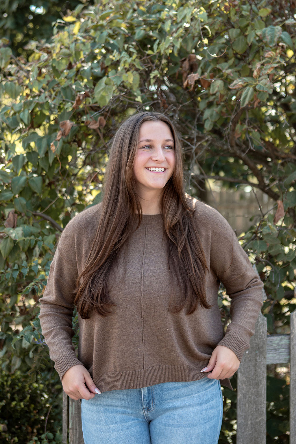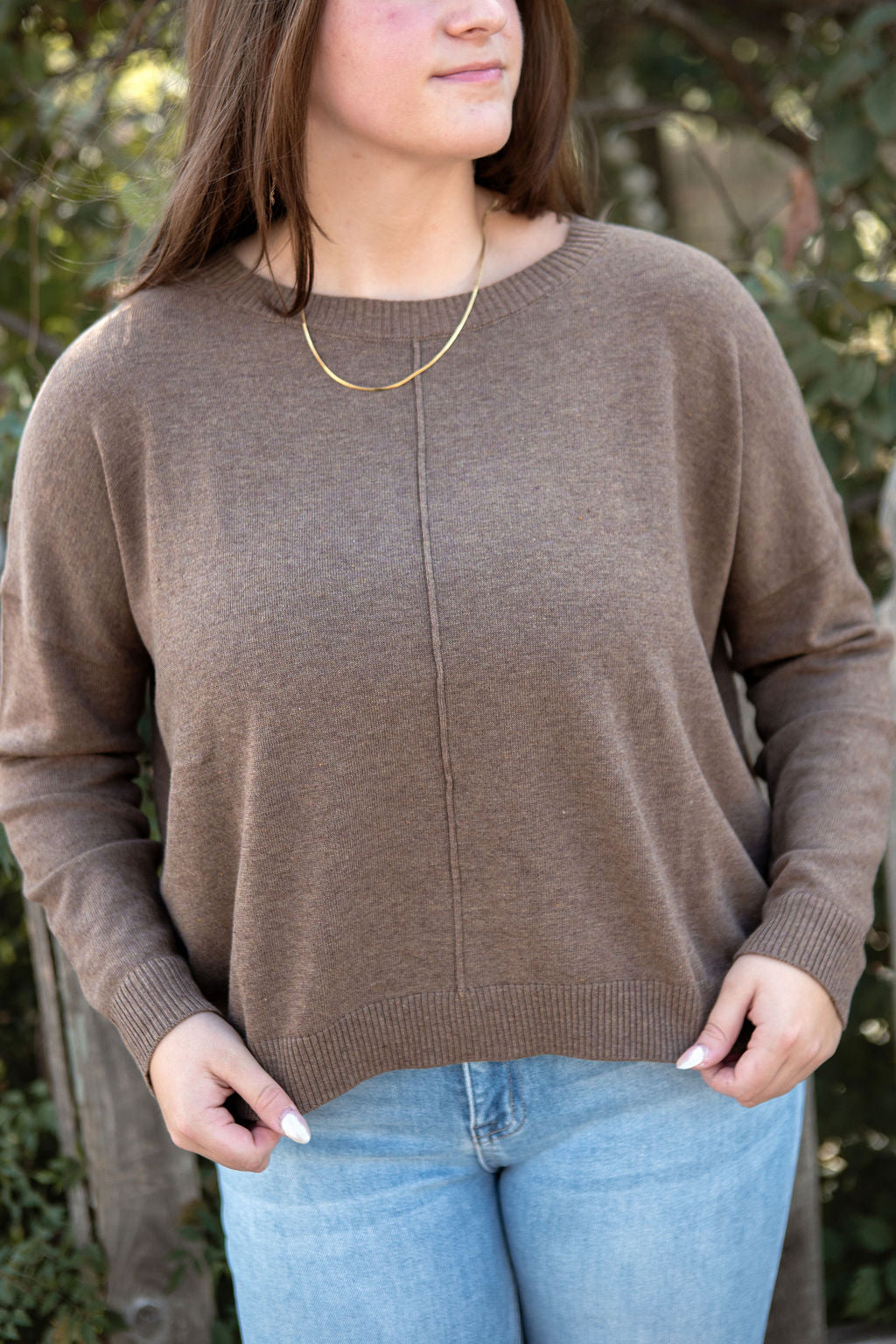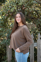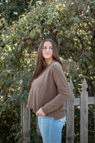 This relaxed knit long sleeve top features a ribbed rounded neckline, dropped shoulders, and ribbed cuffs and hem, finished with a center front seam and side slits that create a subtle high-low design for an effortlessly laid back yet polished look.
