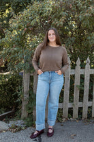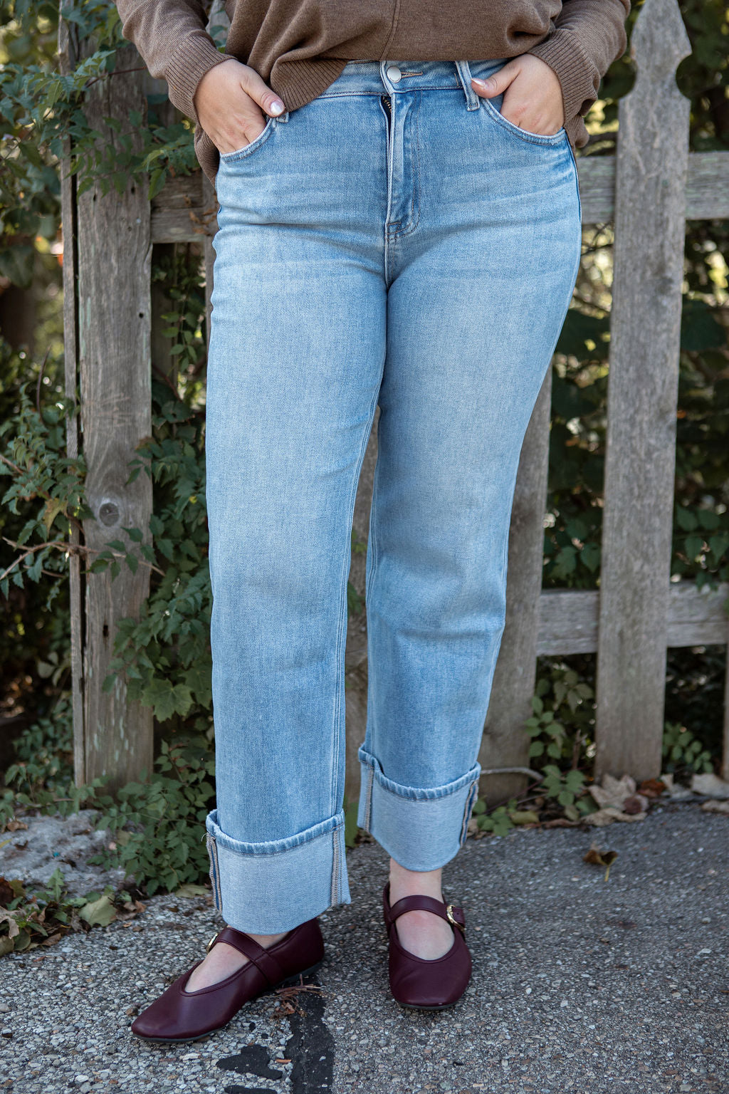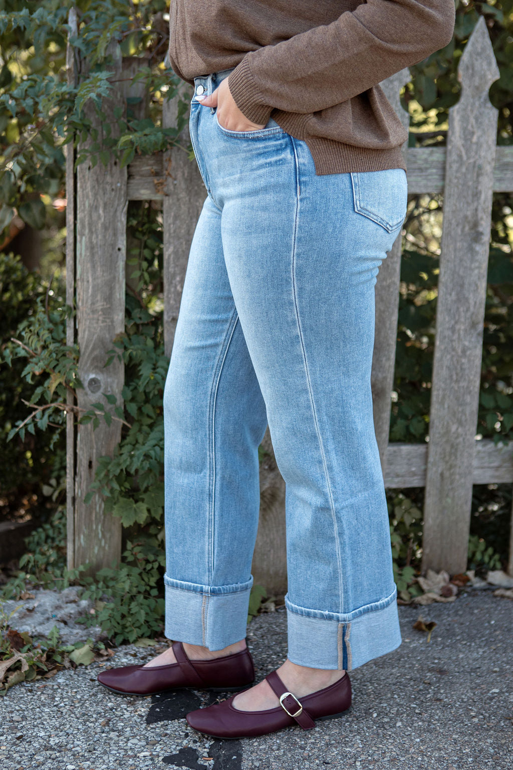 Elan High Rise Medium Light Wash Cuffed Slim Wide Jeans - by Flying Monkey