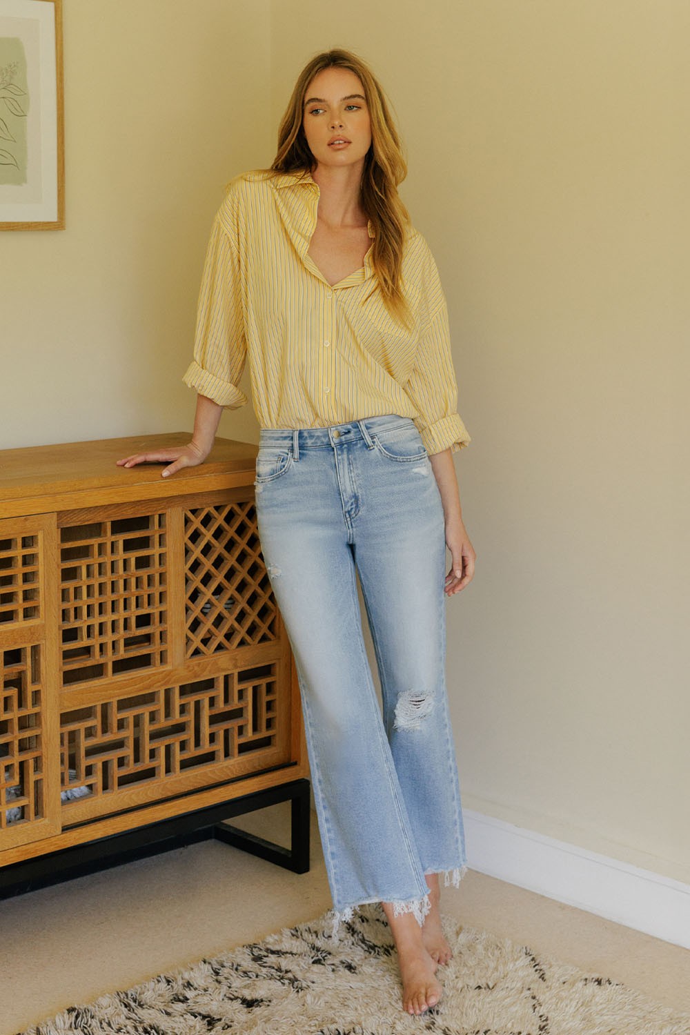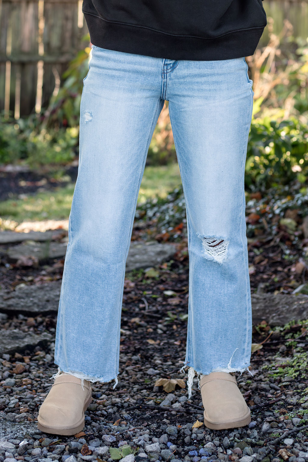 Restocked! These Ezra jeans from Flying Monkey mix a high-rise fit with a playful distressed look. Crafted from comfy stretch denim, they feature a raw hem and a cropped, slim wide-leg cut that adds a fun, fresh vibe to your wardrobe.
