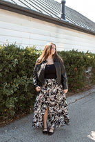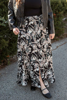 Floral printed maxi skirt featuring a button down front, a smocked waistband and a ruffle bottom.