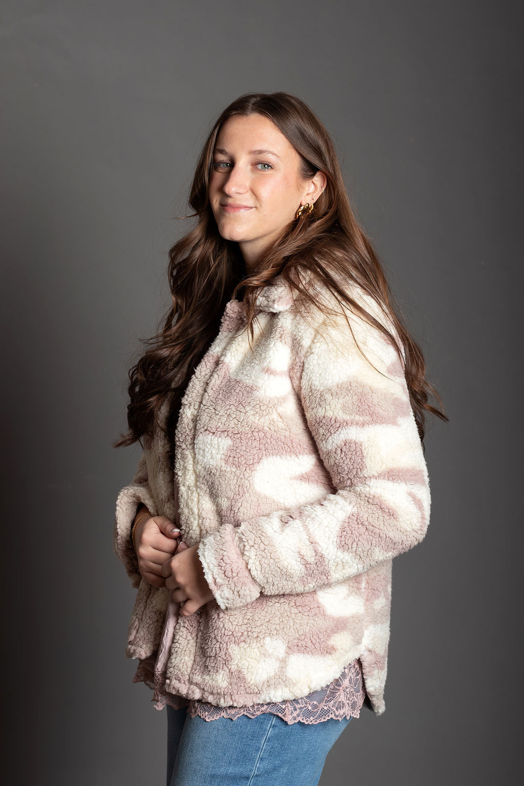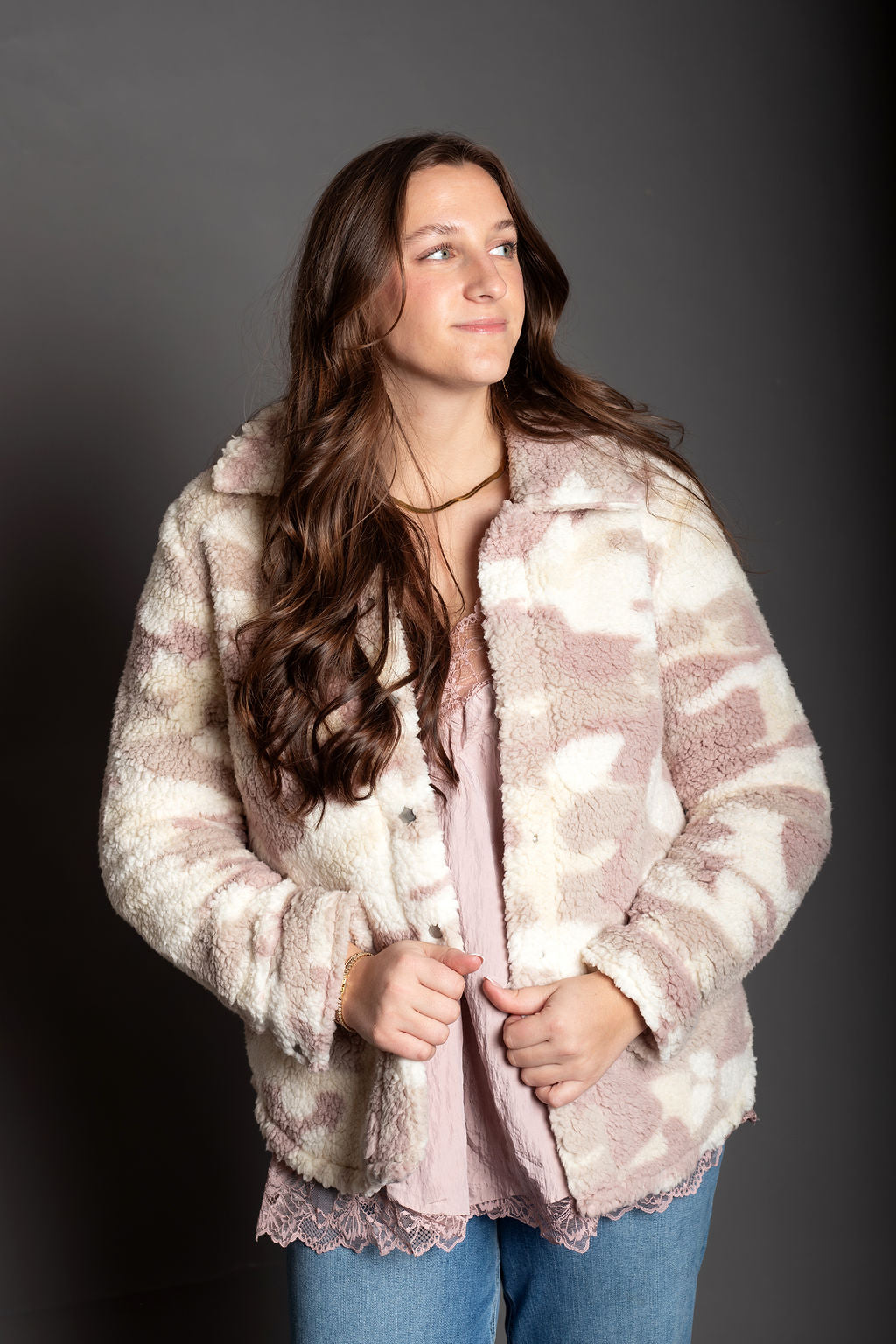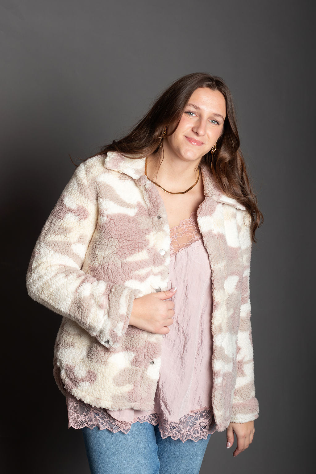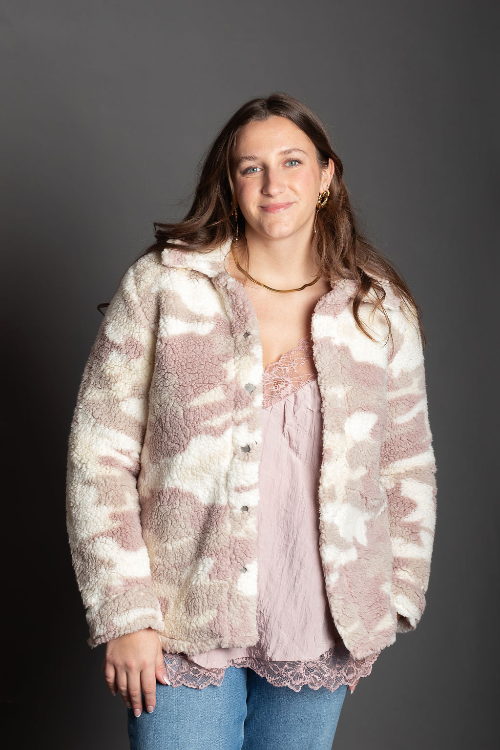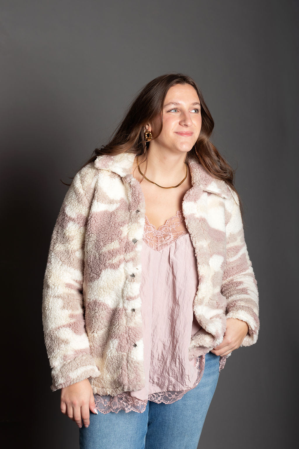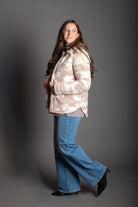 Layer up in cozy comfort with this oversized camo sherpa jacket that's equal parts edgy and snuggly. The soft polyester sherpa lining keeps you warm without the bulk, while the mauve and cream camo print adds an unexpected pop of personality to your everyday look. Perfect for throwing over anything when you need that "I woke up like this" vibe. Oversized fit means room to move, breathe, and basically live your best life.