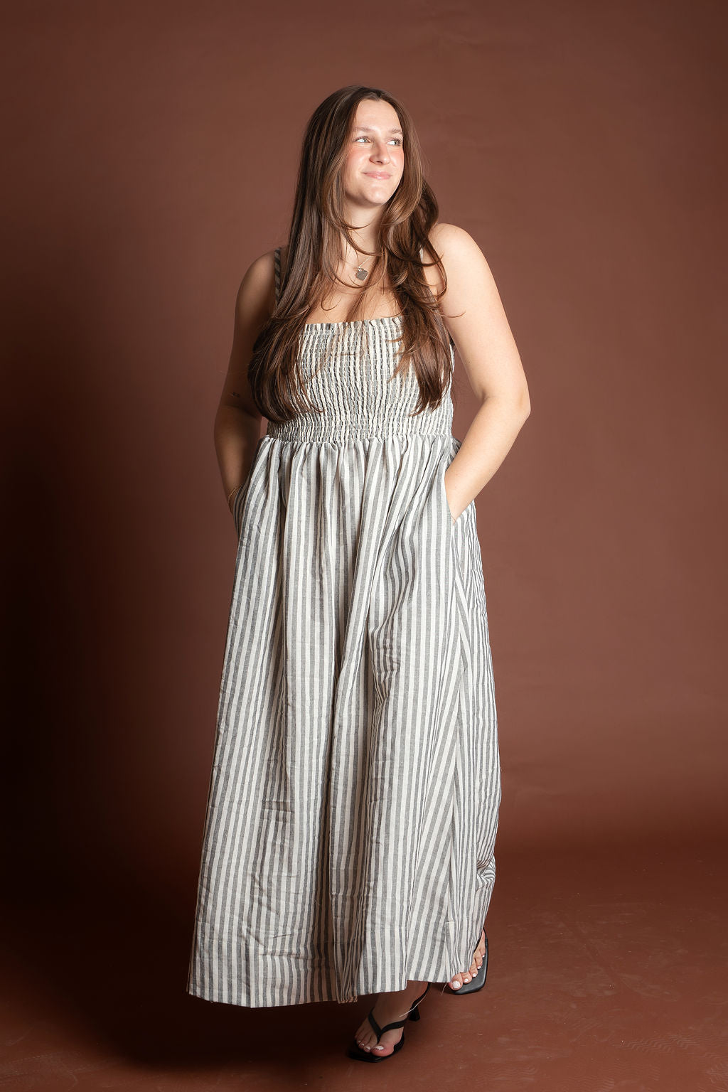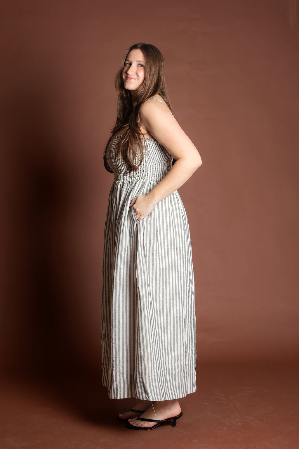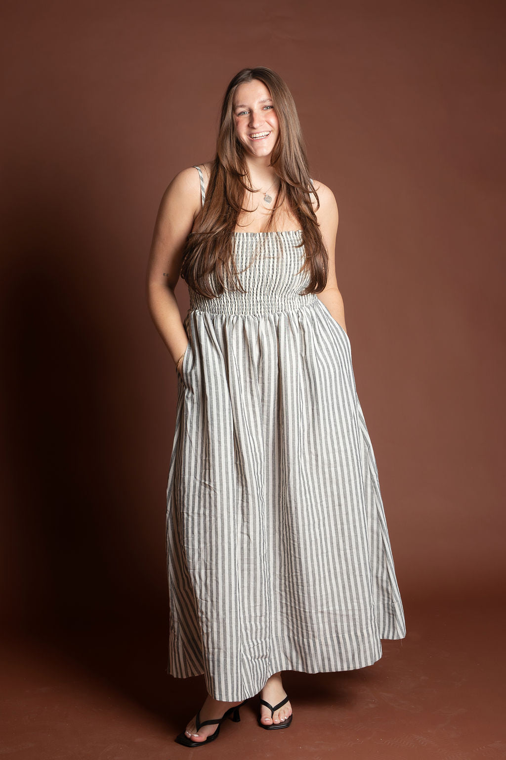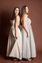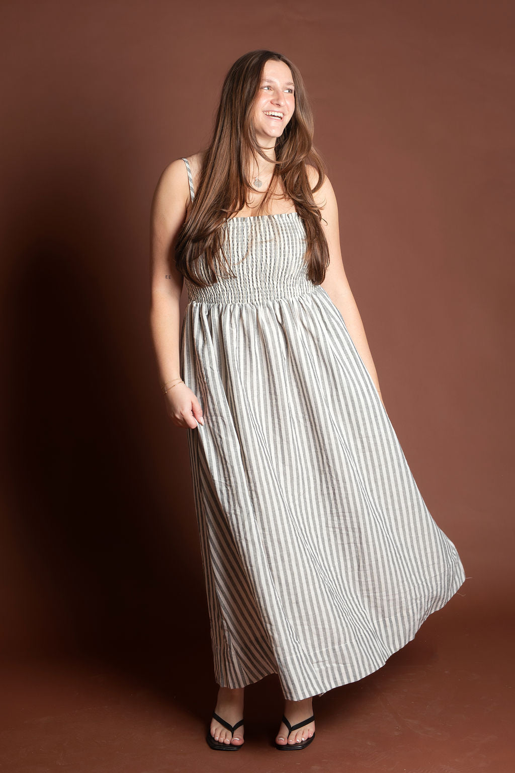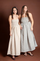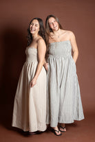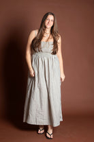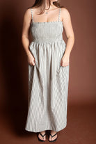 This elegant piece features a flattering smocking detail at the top paired with delicate stripes throughout, creating a sophisticated and feminine look. Made from breathable 100% cotton, this maxi dress is perfect for spring and summer occasions.